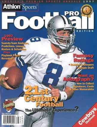 This is an Athlon Sports 1997 Pro Football Magazine with Dallas Cowboys Quarterback Troy Aikman on the cover. This Preview has team analysis, predictions, lineups, rosters and more for the 1997 Season