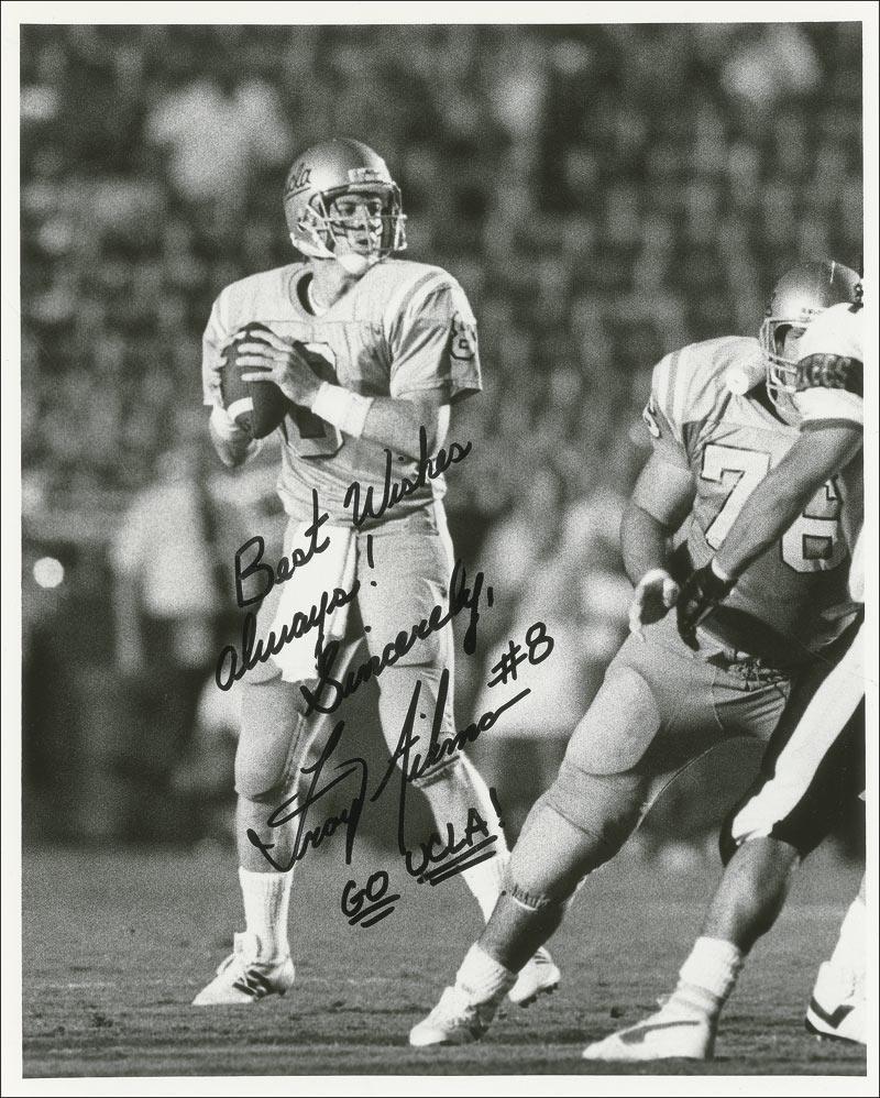 Glossy 8 x 10 photo of Aikman as a college QB, signed in black felt tip “Best Wishes Always! Sincerely, Troy Aikman #8. GO UCLA!” In fine condition with the image a bit grainy.