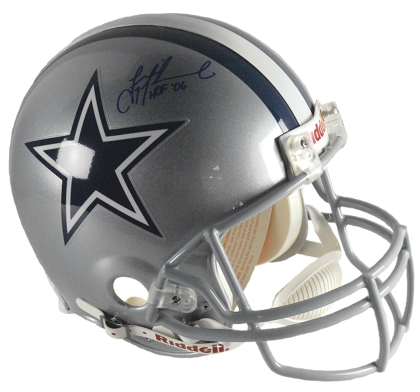 Official Riddell Dallas Cowboys football helmet signed in blue felt tip on the side, “Troy Aikman HOF ‘06.” In very fine condition. Accompanied by a certificate of authenticity from James Spence.