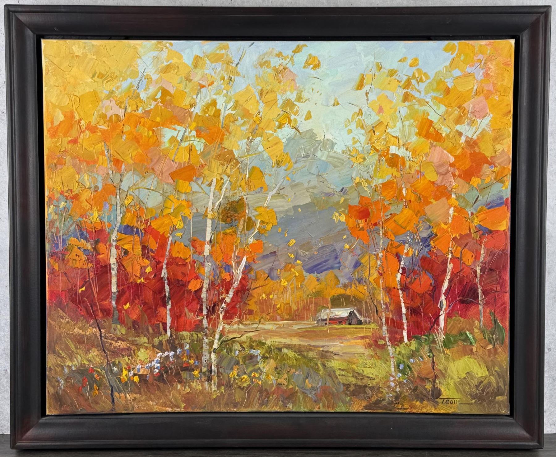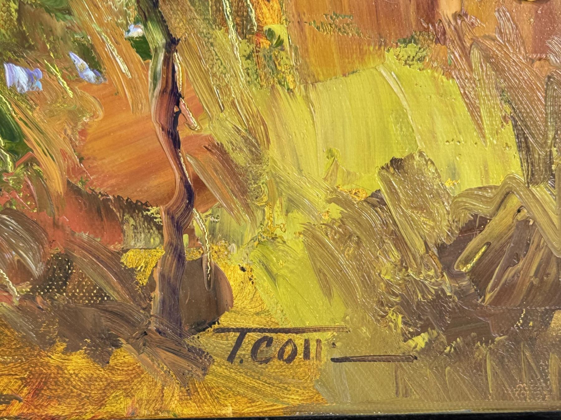 Title is No Place Like Home. 24" by 30" unframed. 28 1/2" by 34 1/2" framed. Oil on Canvas. Troy Collins (20/21st century) is active/lives in Montana, Idaho. Troy Collins is known for Impressionist landscape and floral painting. Troy Collins is a native of Montana, but has called Idaho home for the last twelve years. He has a background in landscape architecture, which provides him with critical principles of design. However, he credits master landscape painter Robert Moore with inspiring his love of Russian Impressionism while developing a respect for the elements, which create quality in an interpretation of subject matter. The truths and principles he has learned from Moore have built a strong foundation in both art and life, and Collins has spent many hours studying and painting with Moore on location and in the studio. He has recently won the Artists Choice at the Chapparal Plein-Air Show.