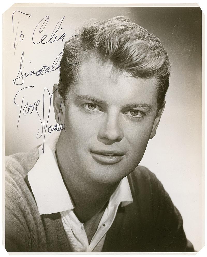 Vintage glossy 7.75 x 9.5 publcity photo of the handsome star, signed and inscribed in fountain pen “To Celia, Sincerely, Troy Donahue.” In very good condition, with diagonal creases and bends crossing his face, scattered spotting to the emulsion, clipped corners, and trimmed edges.