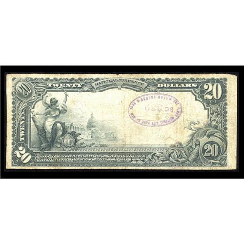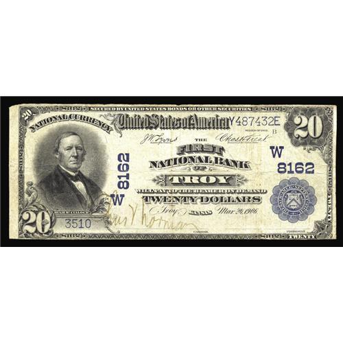 <B>Troy, KS</B></I> - $20 1902 Plain Back Fr. 651 <B>The First NB</B></I> Ch. # (W)8162<BR>This <B>Fine</B></I> addition to the census is only the second $20 Plain Back to surface from here. A bank stamp on the back indicates that it once passed through the National City Bank of New York.