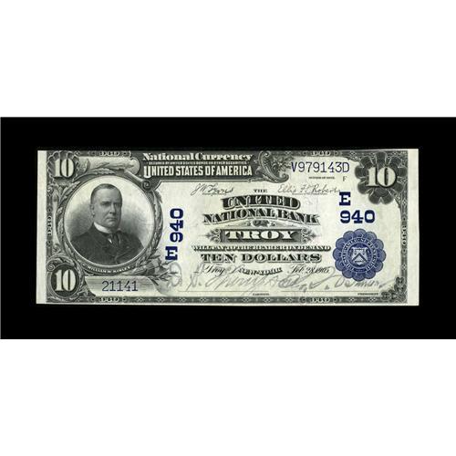 <B>Troy, NY</B></I> - $10 1902 Plain Back Fr. 624 <B>The United NB</B></I> Ch. # (E)940<BR>The census from here includes just four of the $10 Plain Backs. We've handled this note once before, in our 1999 Greater Cincinnati Numismatic Exposition Sale, where it went for $192.50. Next offered at the 2004 Chicago Paper Money Expo auction, where a stronger market carried it to a realization of $488.75. Available once again, we anticipate that this <B>Crisp Uncirculated</B></I> note will sell for about...<BR><BR><b>Shipping:</b> Coin/Currency (<a target="_blank" href="http://www.heritageauctions.com/common/shipping.php">view shipping information</a>)
