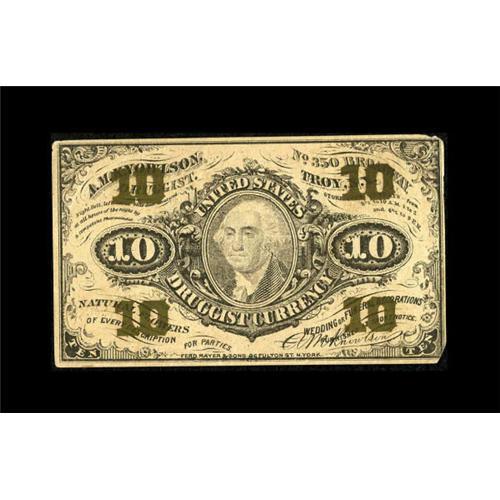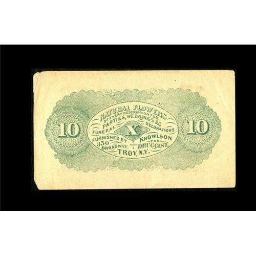 <B>Troy, NY- A.M. Knowlson </B></I> Ad Note<BR> A wonderful Fractional Currency lookalike which we've not seen before. The front is a near perfect Fractional reproduction right down to the overprinted "10" in gold ink and is marked "United States Druggist Currency" and both the front and back contains information about druggist Knowlson's floral business. <B>Extremely Fine,</B></I> with a small corner tip off. <BR><BR><b>Shipping:</b> Coins & Currency (<a target="_blank" href="http://www.heritageauctions.com/common/shipping.php">view shipping information</a>)