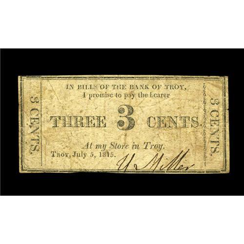 <B>Troy, NY- U. Miller</B></I> 3¢ July 5, 1815 Harris 85<BR>An extremely rare early Troy note listed as R-7 in Harris. Pleasing <B>Fine+.</B></I>