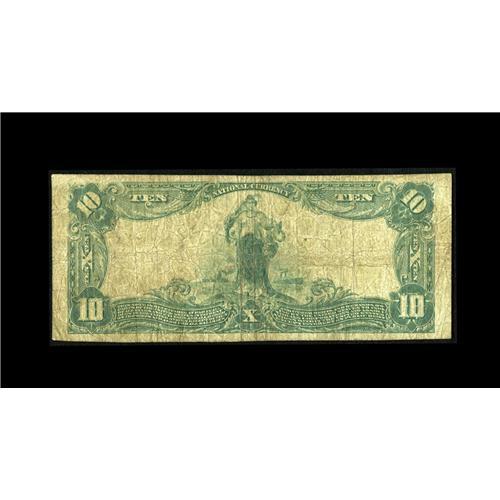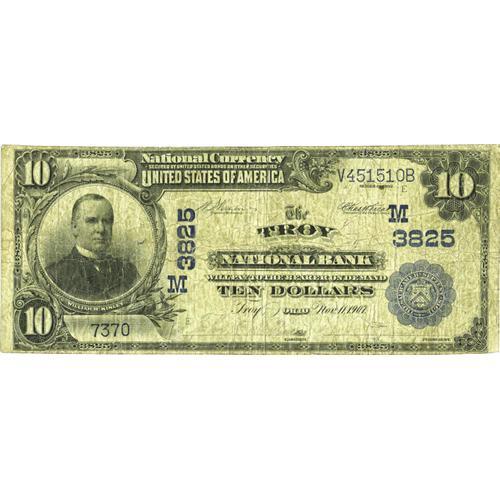 <B>Troy, OH</B></I> - $10 1902 Plain Back Fr. 626 <B>The Troy NB</B></I> Ch. # (M)3825<BR>This note is from one of the five communities in the country to bear this town name and displaying the first of two titles under which it issued Plain Backs. Just six large notes are known with this title, with tonight's offering a problem free for the grade <B>Very Good</B></I> we'd have classified as fully Fine with a touch less circulation soil. Although the signatures have faded considerably, the note is amply margined all around and as one of only two $10 Plain Backs with this title deserves a strong bid. Acquired by our consignor quite some time ago at a cost of $45.10. Certain to handily surpass that level by a strong multiple tonight.