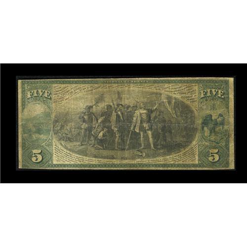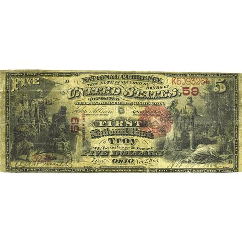 <B>Troy, OH</B></I> - $5 1875 Fr. 401 <B>The First NB</B></I> Ch. # 59<BR>This is one of the scarcer first 100 charters, with this institution issuing only until its close in 1923. Just a literal handful of First Charters are known from here, with this piece perhaps the same note sold in the legendary Grinnell sale as Lot 4350. This example bears the earliest plate date used on any National Bank Note, November 2, 1863. <B>About Fine.</B></I>