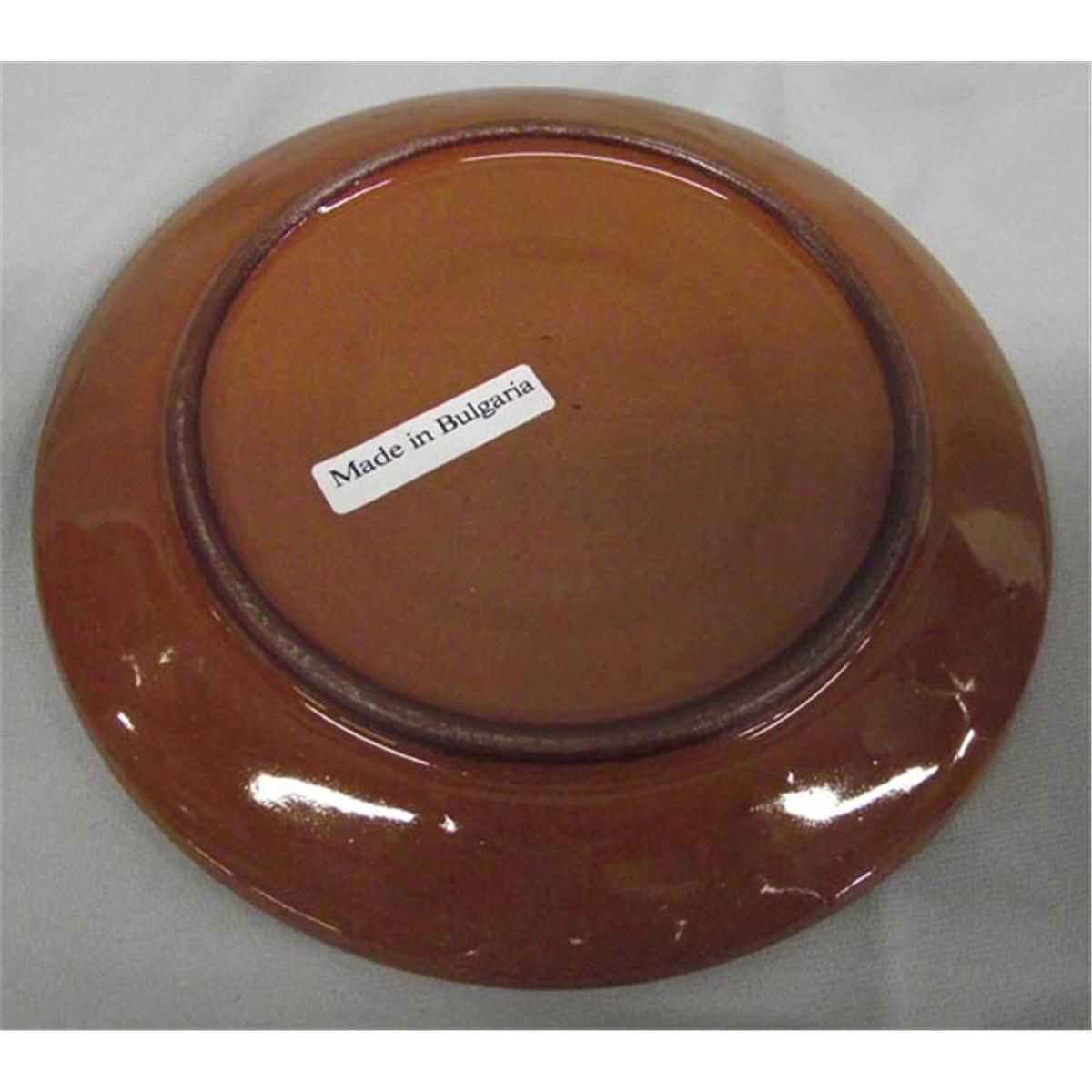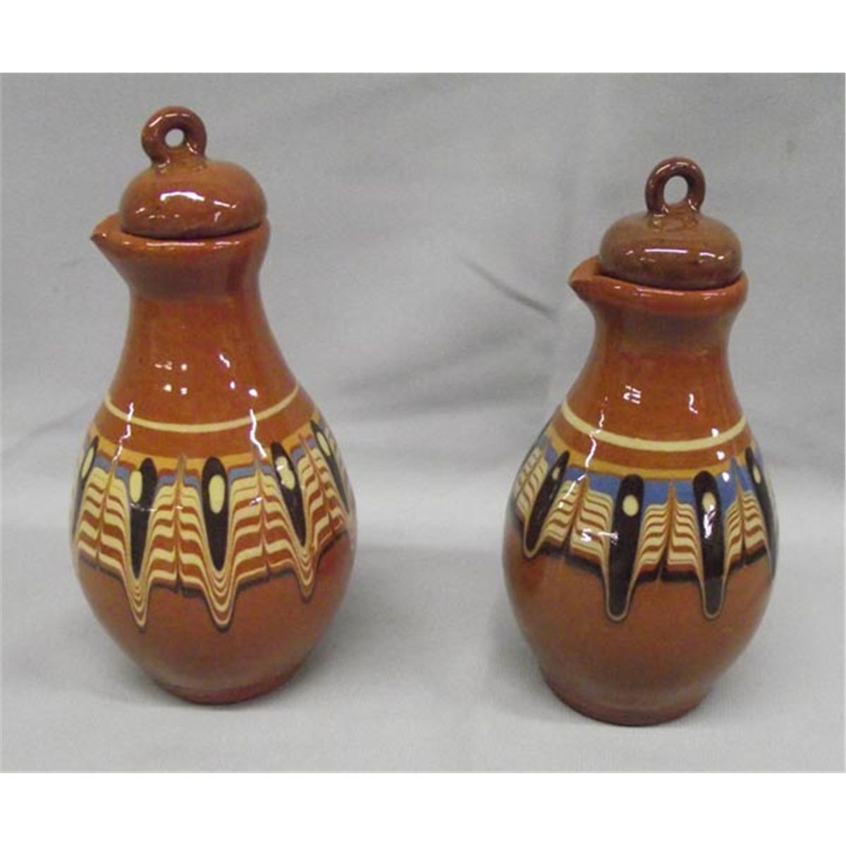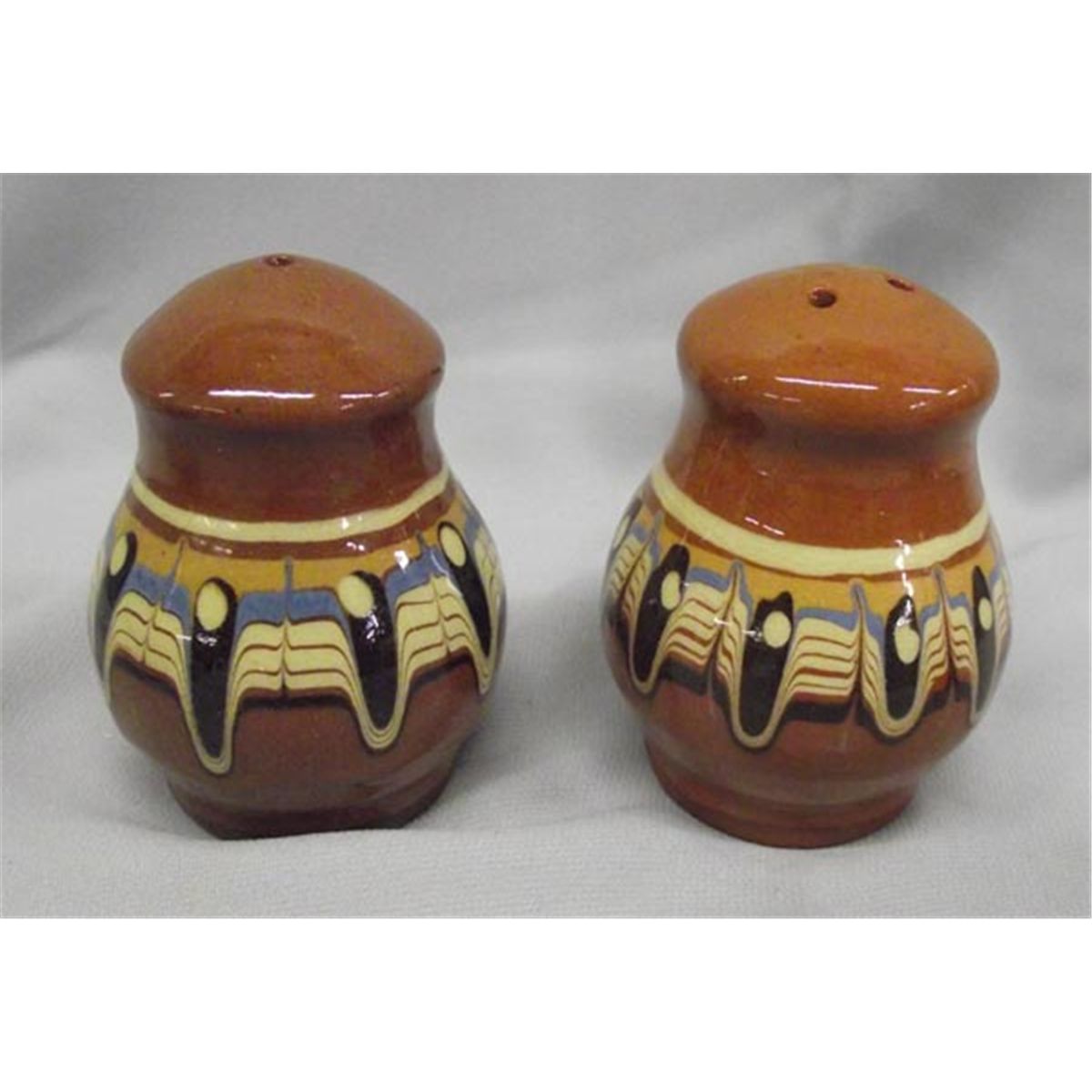 Bulgarian pottery - this is known world wide as "TROYAN" pottery. The special painting technique is famous and comes from this one town in Bulgaria. It is fairly expensive, available online from a few places. Bulgarian Condiment Set. Salt, pepper, 2 oil/vinegar jars with lids and plate. Lead free, peacock pattern. Plate measures approx. 7 1/2'' diameter, oil/vinegar jars measure approx. 6''H. Buyers Pay Actual Shipping and Handling Charges(see terms and conditions for more information).