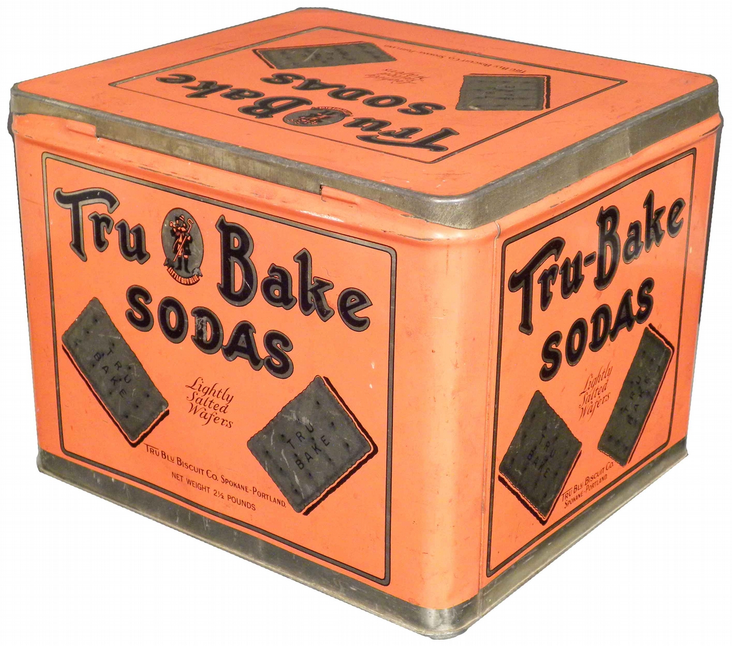 Tru Bake Sodas Store Bin. Tru Blu Biscuit Co. Spokane-Portland. A few rubs otherwise very good condition. 9 X 7 X 8 inches.
