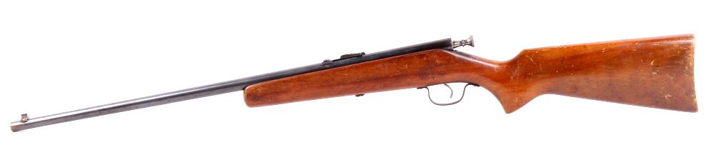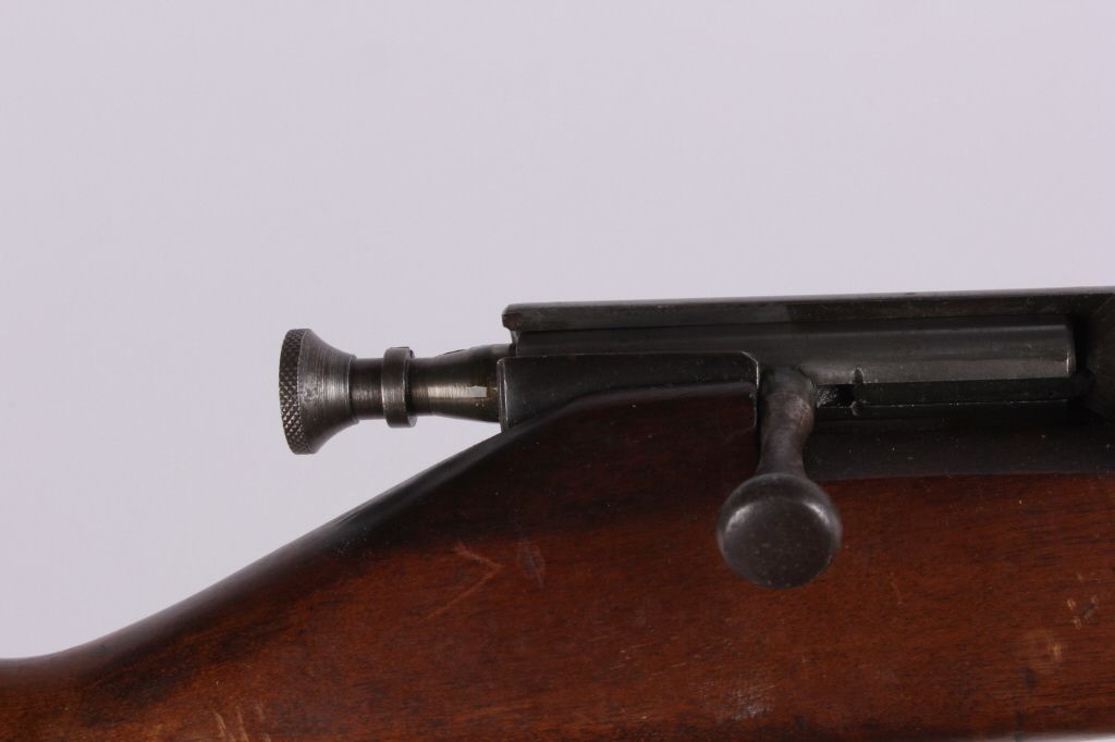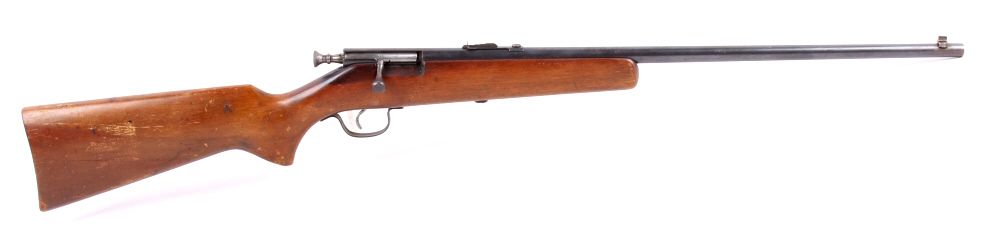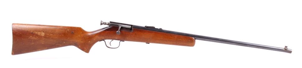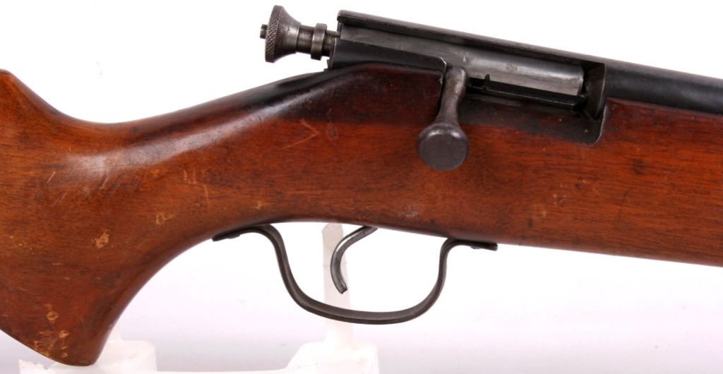 This is a 1940's .22 long rifle rim fire bolt action single shot rifle. The piece shows working condition and normal handling dings on the wood. No Serial Number.
