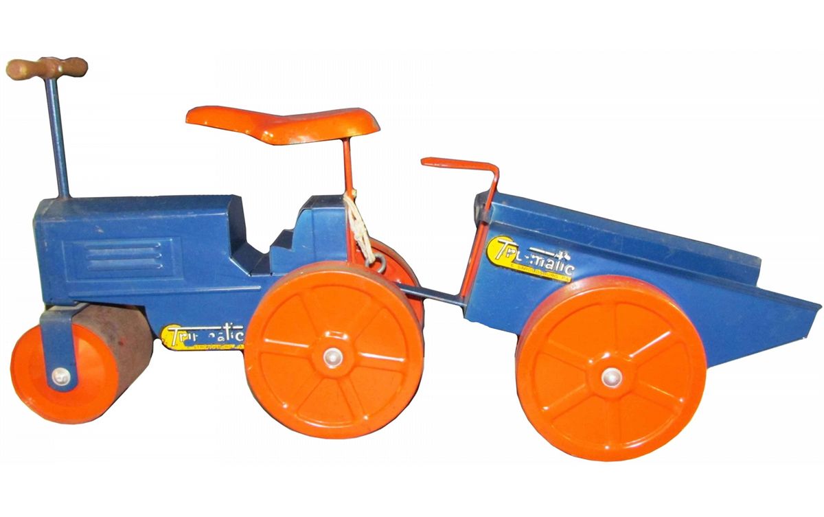 1930's Tru-matic Pressed Steel Sit and Ride Steam Roller with trailer. Very good all original condition. 38 inches overall.