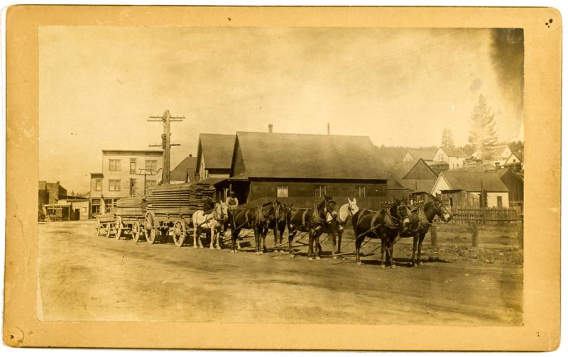 Photograph measures 8 ¼ x 5’’ on tan matte. Matte is slightly worn with pin holes in the upper right and lower left corner and a tear on the left side. Medium to low contrast and focus is sharp. The photo has slight wear with a mark in the top right corner. Two men sit on mules that are pulling lumber. The mule train sits ideal in the street, homes and stores can be seen in the background. Photographer is indentified as Herman Kimball and photographed Truckee between 1874 and 1886.