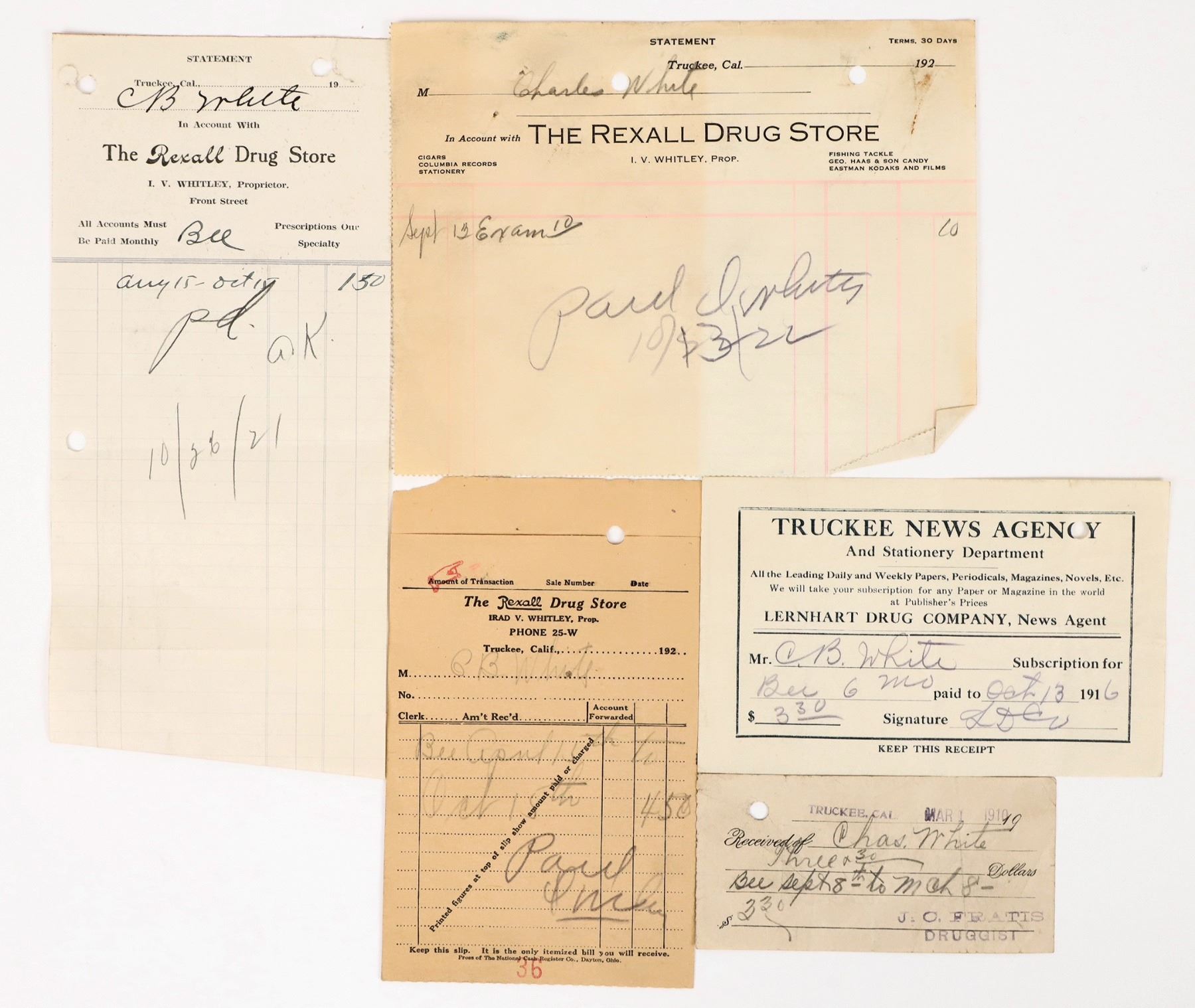 Lot of 6. All featured in Fred Holabird's bottle book. Four pieces are for the Rexall Drug Store (three receipts, 1920s) plus stub receipt; Truckee News Agency / Lernhart Drug Company agent, subscription receipt, 1916; and 1910 receipt tag from JC Fratis, Druggist.