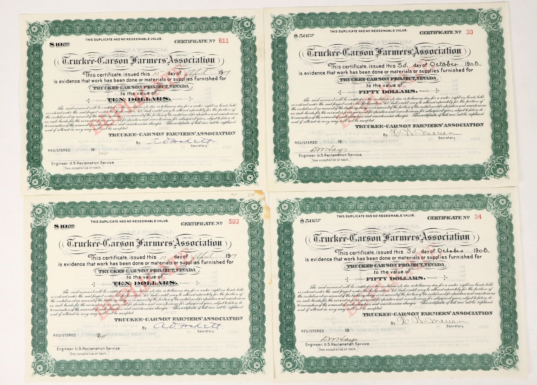 These are stock certificates from the Truckee-Carson Farmers Association issued in 1908. There are four stocks. Please see photos for details. The Truckee-Carson Farmer's Association controlled the Truckee-Carson project and the building of the Truckee Canal, to run water from the Truckee River to the Carson River. They also controlled the dam at the outlet of Lake Tahoe, making it a water storage reservoir.