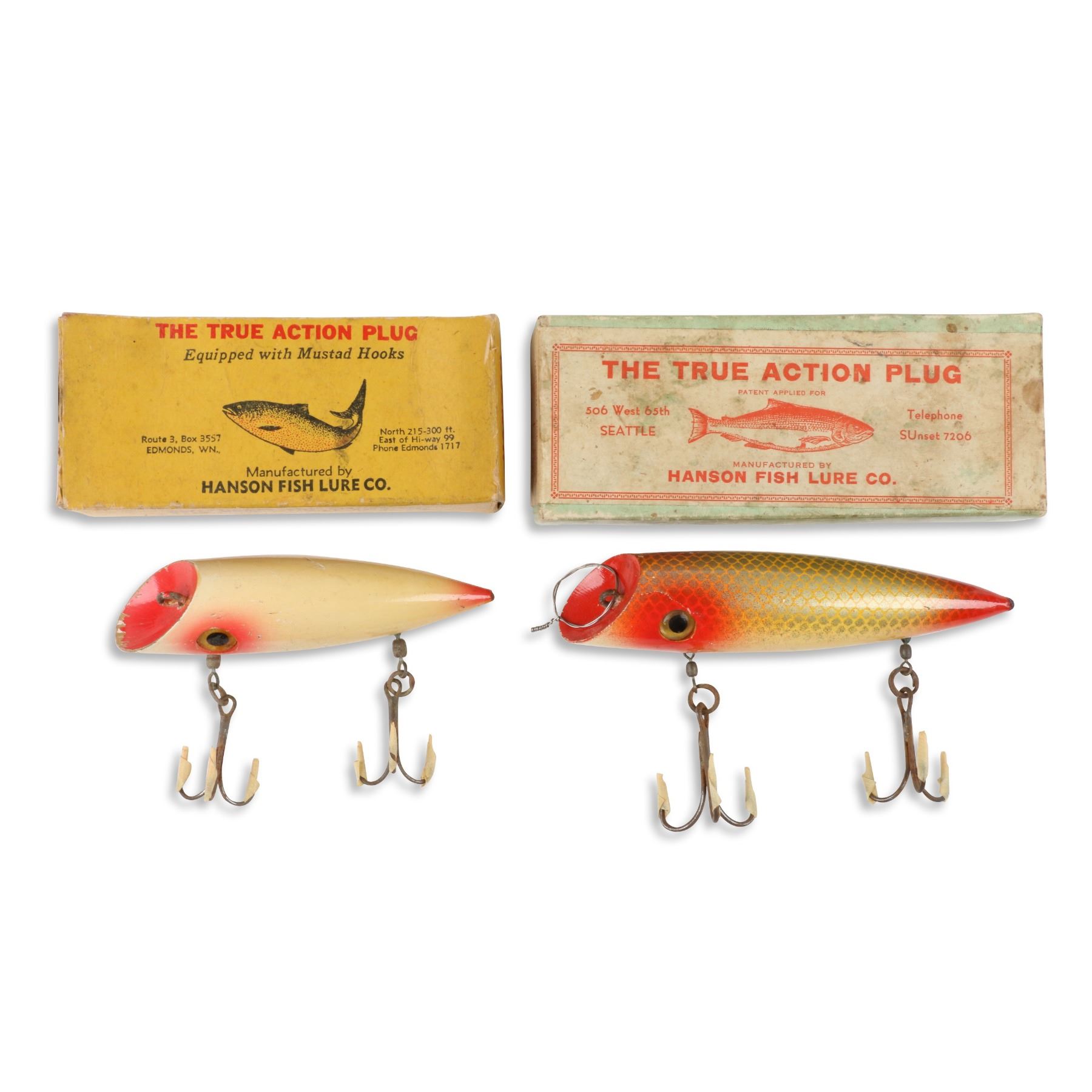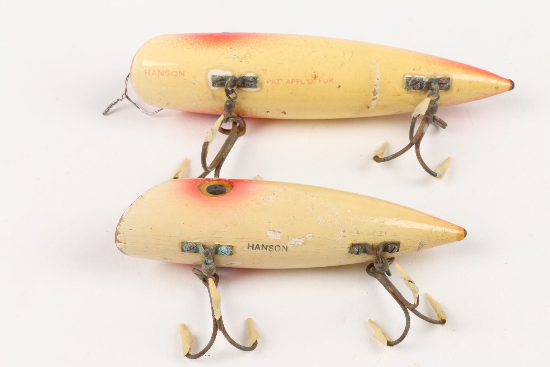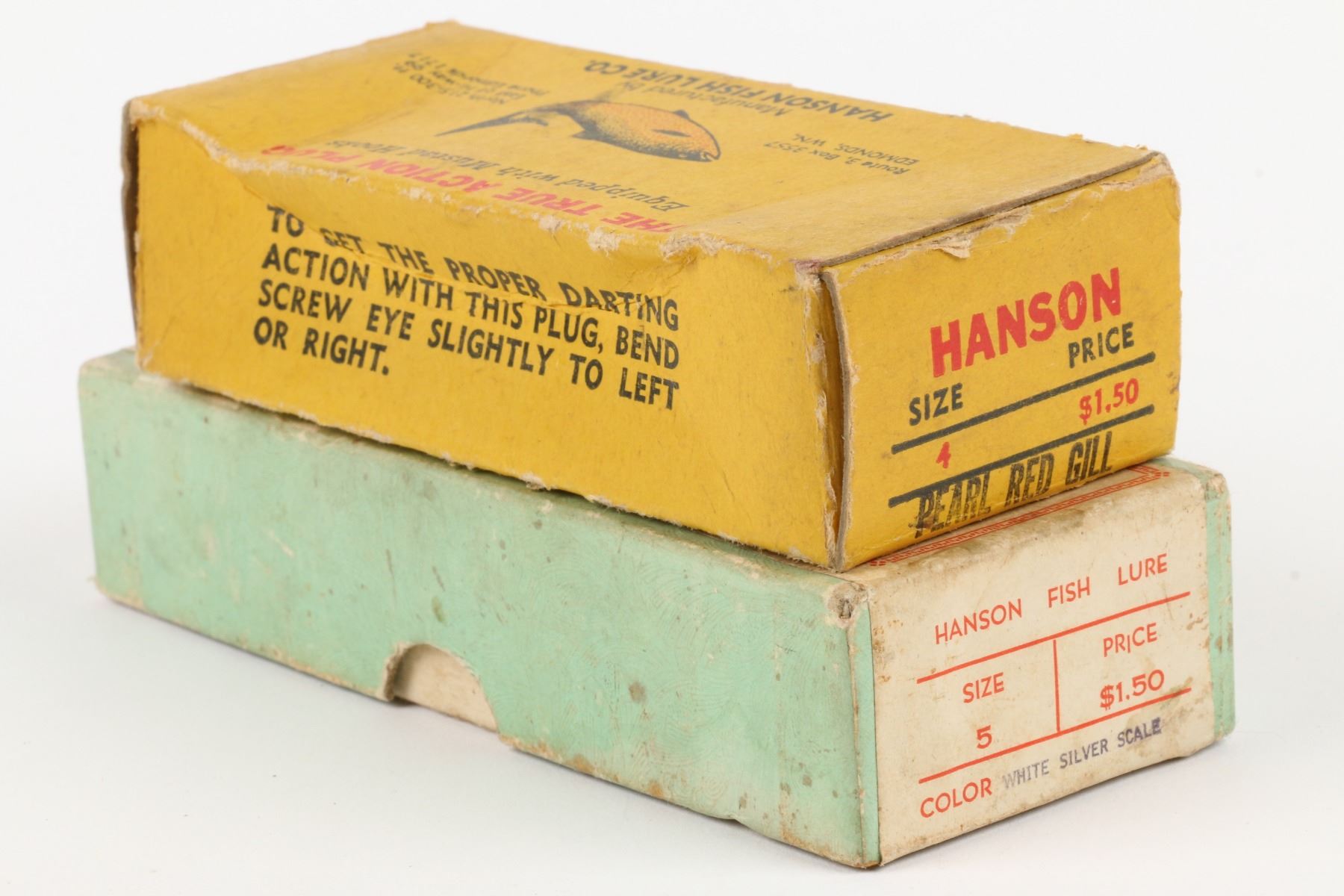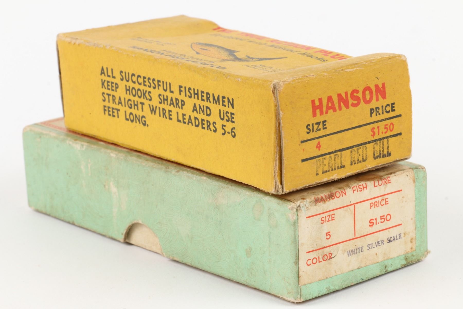 Hanson Fish Lure Co., United States. Boxed. Material: Wood. Quantity: 2. Grade: G+. 4.5" - 5.5" boxes. Est. $100-125.