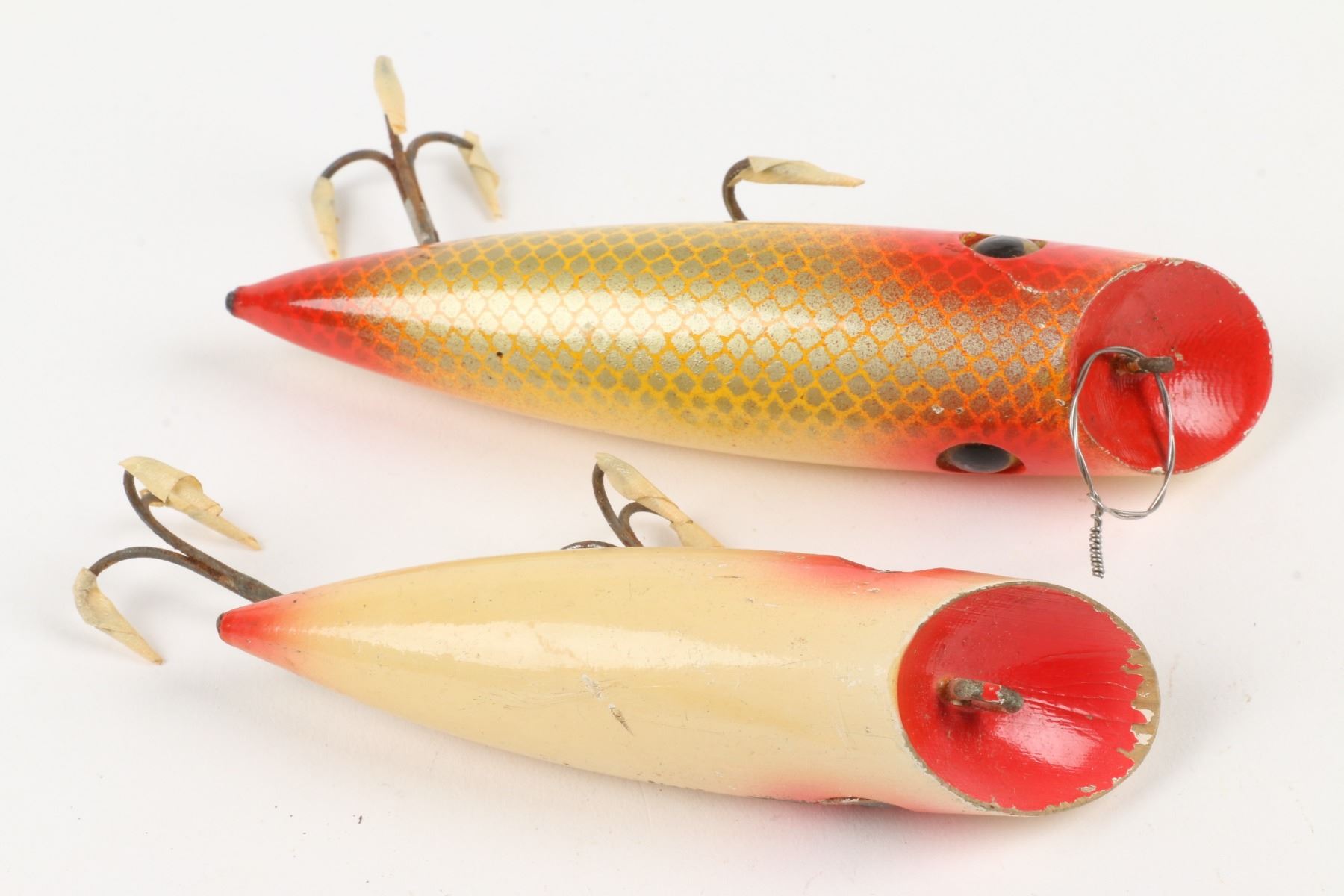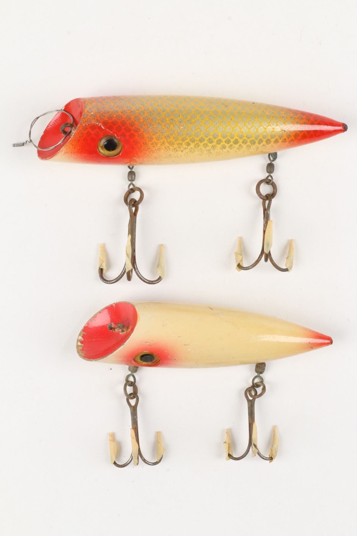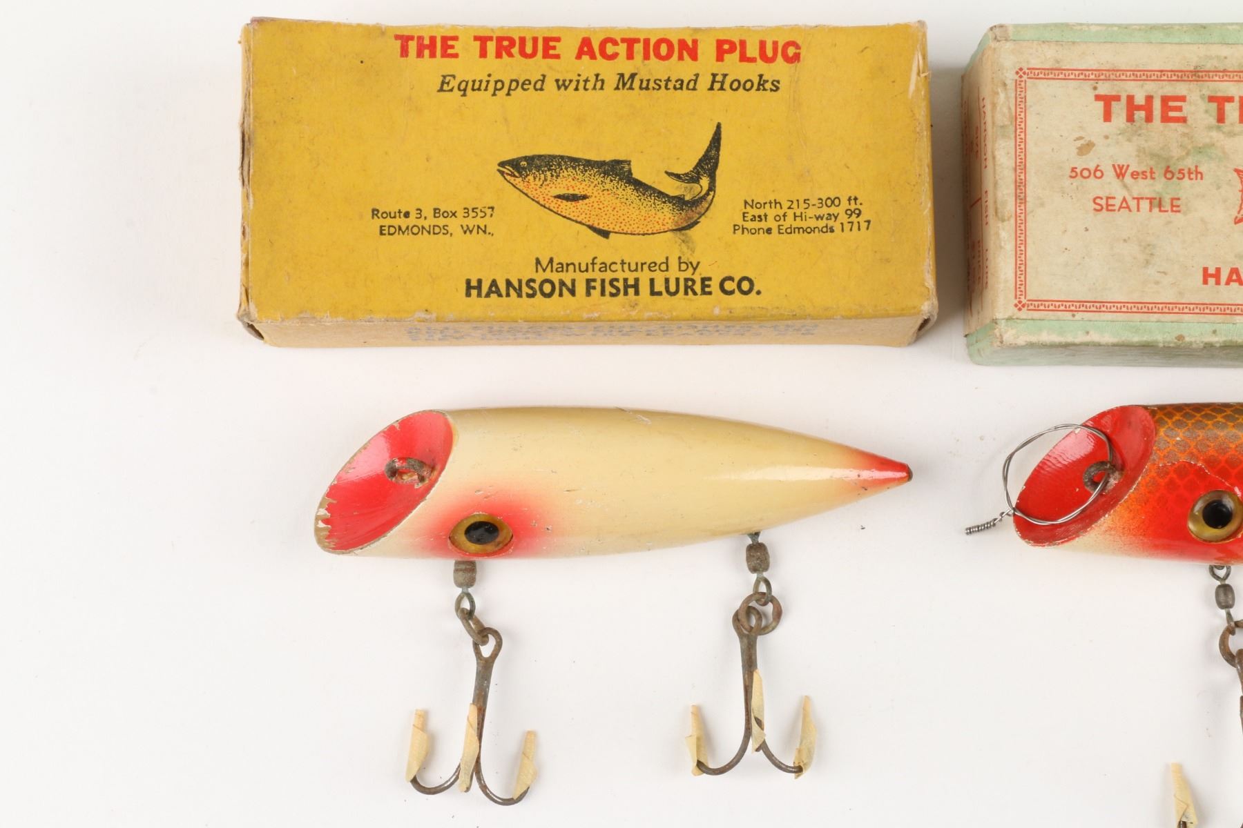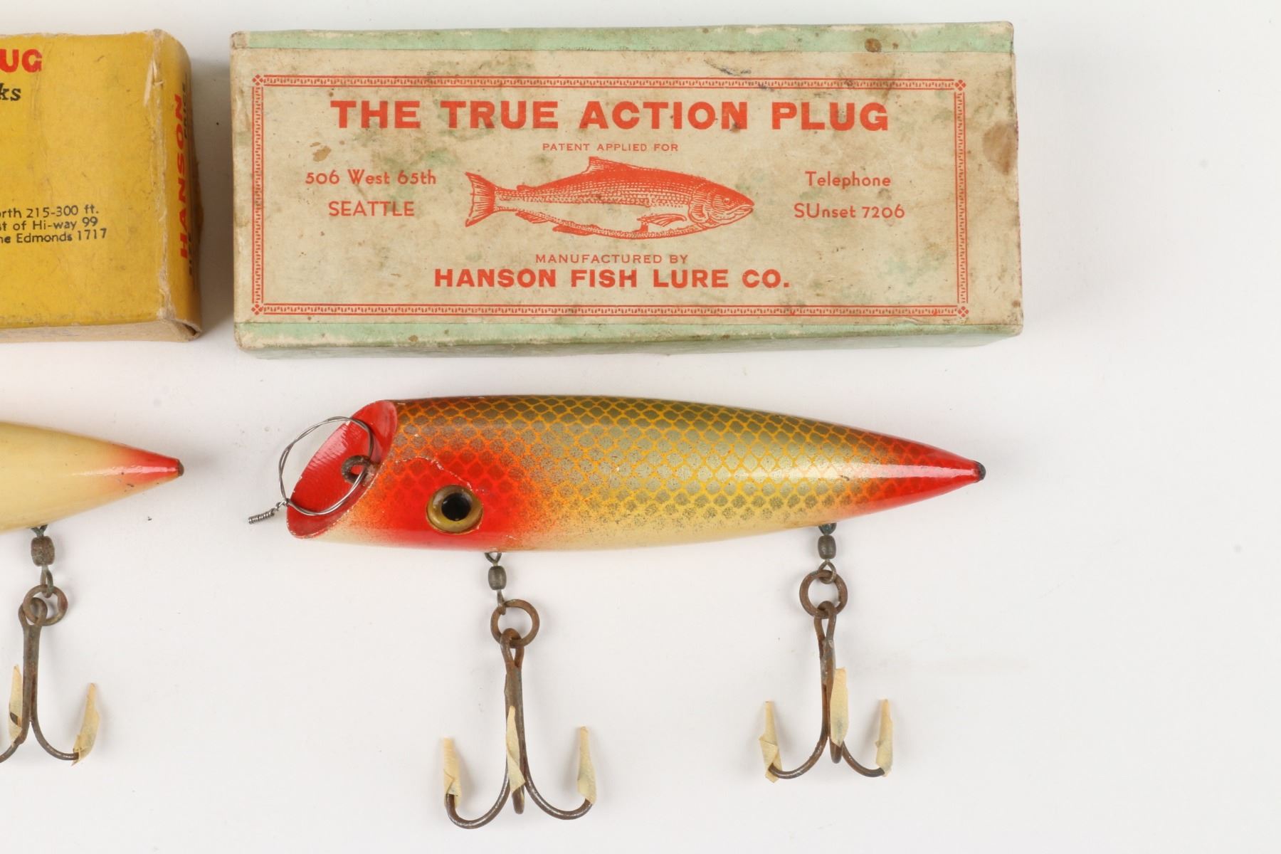 Hanson Fish Lure Co., United States. Boxed. Material: Wood. Quantity: 2. Grade: G+. 4.5" - 5.5" boxes. Est. $100-125.