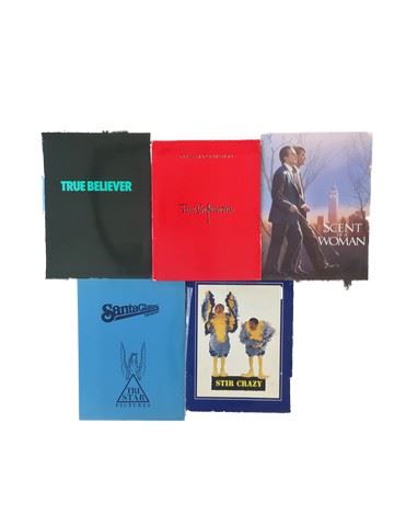 Collection of 5 press kits with black and white publicity stills, sized mainly 8x10's from various movie studios. (1980's-90's). From Columbia Pictures "True Believer" (1989) starring Robert Downey Jr. as Roger Baron, James Woods as Eddie Dodd, and Margaret Colin as Kitty Greer, includes 4 stills. From United Artists "True Confessions" (1981) starring Robert De Niro as Monsignor, Robert Duvall as Detective Spellacy, and Charles Durning as Jack Amsterdam, includes 17 stills. From Universal Studios "Scent of a Women" (1992) starring Al Pacino as Lt.Col. Frank Slade, Chris O'Donnell as Charlie Simms, and James Rebhorn as Mr. Trask, includes 10 stills. From Tri Star Pictures "Santa Claus" (1985) starring Dudley Moore as Patch, David Huddleston as Santa Claus, and John Lithgow as B.Z., includes 15 stills. From Columbia Pictures "Stir Crazy" (1980) starring Gene Wilder as Skip Donahue, Richard Pryor as Harry Monroe, and George Stanford Brown as Rory, includes 14 stills.