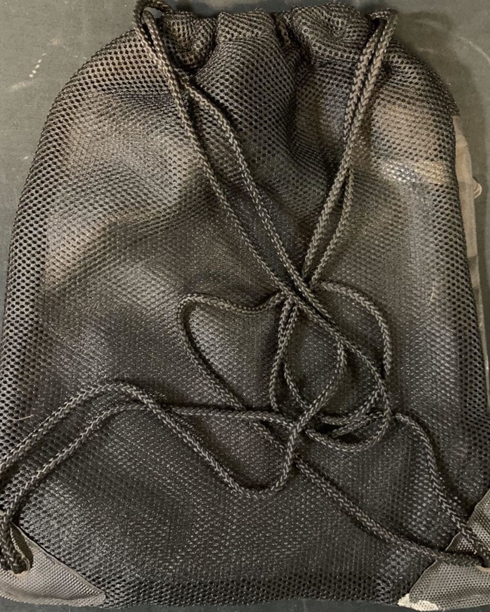 The Bag is Port Authority brand, has draw stings, and measures approx. 17" tall x 13" wide.