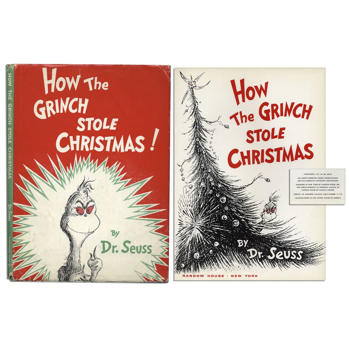 First edition, first printing of ''How The Grinch Stole Christmas'', published by Random House: New York: 1957. This example of Dr. Seuss' beloved tale of the villainous Grinch and his plans to spoil an entire town's holiday contains all relevant points, including the list of 13 titles on one of the last leaves and 14 titles listed on the rear flap of the 250/250 unclipped dustjacket. Unpaginated story is bound in pictorial paper boards. Measures 8.25'' x 11.25''. Wear to board edges, else fine. With dustjacket in near fine condition save for some wear to edges. A scarce first printing of a beloved classic in near fine condition.