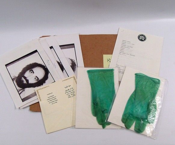 True Lies Terrorist Files Documents Gloves Props - True Lies Terrorist Files, Documents, Gloves Props - Perhaps every man's or woman's fantasy is to find out your mate isn't the boring nobody you're stuck with, but in fact, lives a secret exciting action-packed life as a Secret Agent. That is the premise of the blockbuster Arnold Schwarzenegger feature "True Lies" (1994). These are a set of actual screen used Omega Sector Classified files, photos, documents and gloves used by the leader of the terrorists, Faisil (Grant Heslov). (Approx. 15" x 8 1/2")