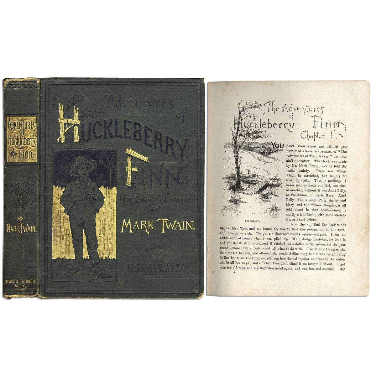 First edition of ''Adventures of Huckleberry Finn'' by Mark Twain with illustrations by E.W. Kimble. New York: Charles L. Webster and Company: 1885. First edition of the beloved classic that became the wellspring of American literary fiction. Hemingway once said of it, ''All modern American literature comes from just one book by Mark Twain called 'Huckleberry Finn.''' All but one first printing points present including: (1) heading for chapter 6 reads ''decided'' (later corrected to ''decides'') on page 9; (2) ''Him and another man'' listed incorrectly at page 88 (on page 13); (3) page 57, 11 lines from bottom, reads: ''with the was''; (4) ''Heliotype Printing Co.'' imprint is present on frontis; (5) on page 155, the second ''5'' is missing; (6) page 143: ''l'' missing in ''Col.'' (that is part of the illustration at the top line of text). This copy lacks the title page and there is some light rubbing to boards and foxing to endpapers. With some archival restoration to preserve condition, overall a presentable copy in very good condition.