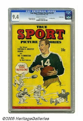 <B>True Sport Picture Stories V2#5 Crowley Copy pedigree (Street & Smith, 1944) CGC NM 9.4 Off-white to white pages.</B></I> Features stories on Lou Gehrig and Don Hutson. There's even a contribution by onetime Notre Dame coach Hunk Anderson. Only copy of the issue to be certified by CGC to date. Overstreet 2005 NM- 9.2 value = $215. CGC census 5/05: 1 in 9.4, none higher.