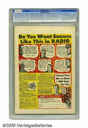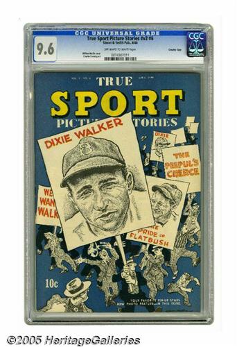 <B>True Sport Picture Stories V2#6 Crowley Copy pedigree (Street & Smith, 1944) CGC NM+ 9.6 Off-white to white pages.</B></I> Can you name a ballplayer who shared the dugout with both Babe Ruth and Jackie Robinson during his career? The answer's this issue's coverboy Dixie Walker, who was a Yankee in the early 1930s and later a Brooklyn Dodger. This pedigree copy is one of only two that CGC has certified as of this writing, with the other one strictly a minor-leaguer at 7.5. Overstreet 2005 NM- 9.2 value = $215. CGC census 5/05: 1 in 9.6, none higher.