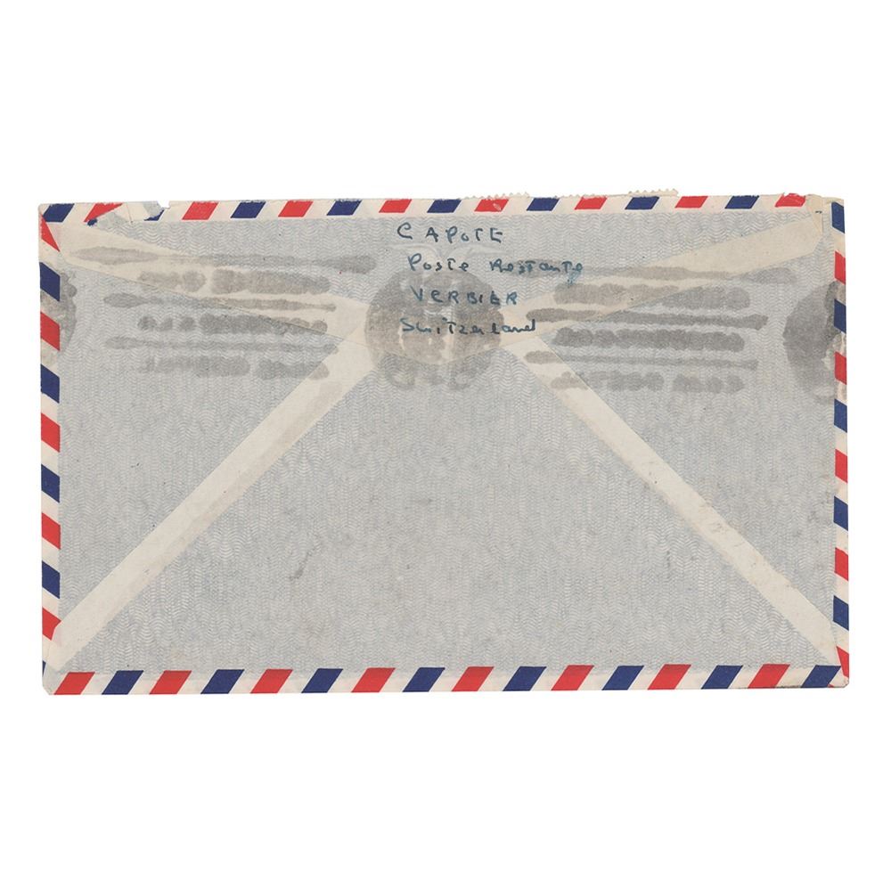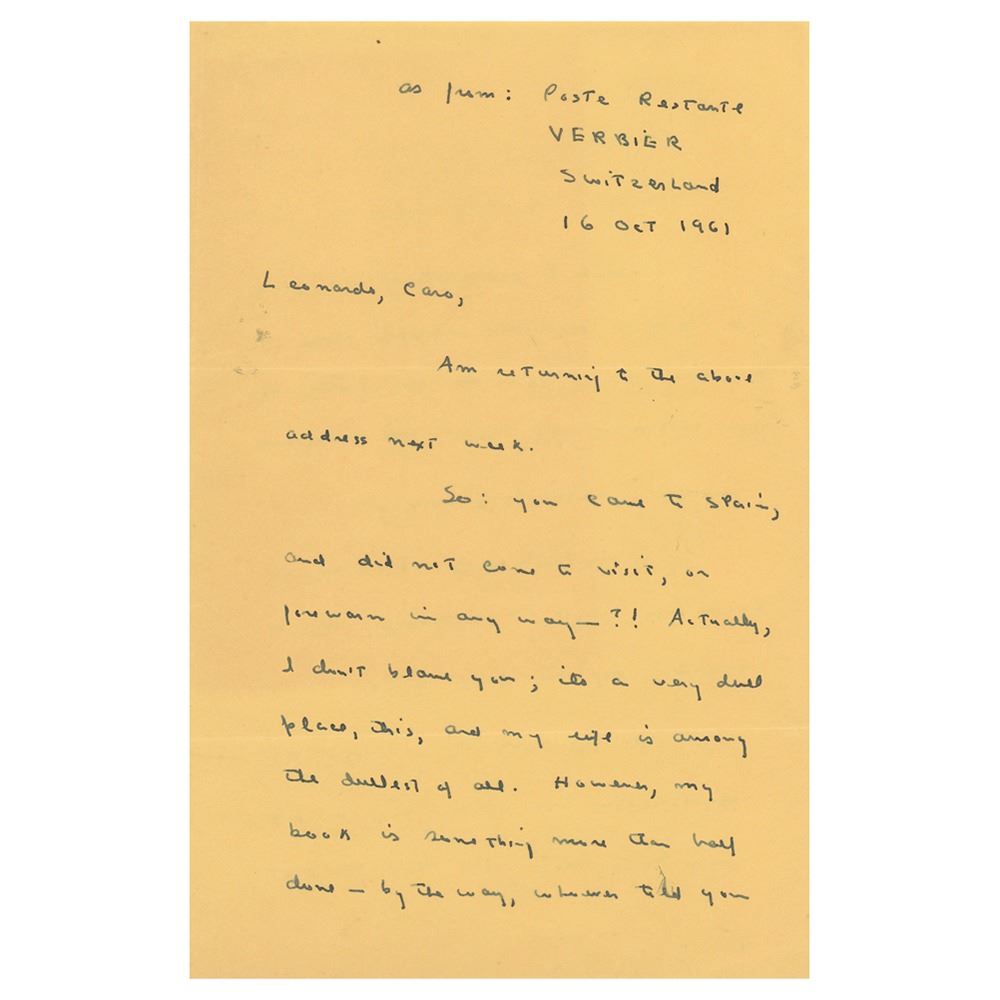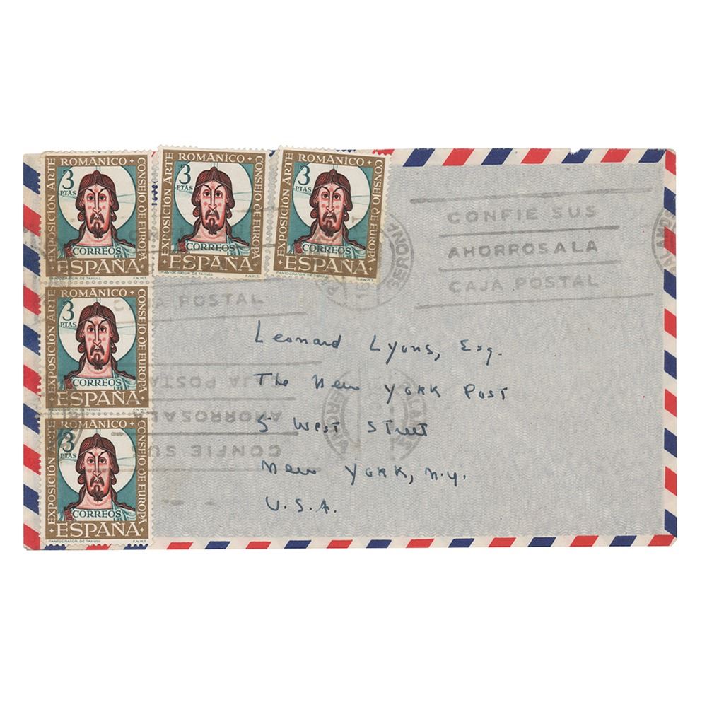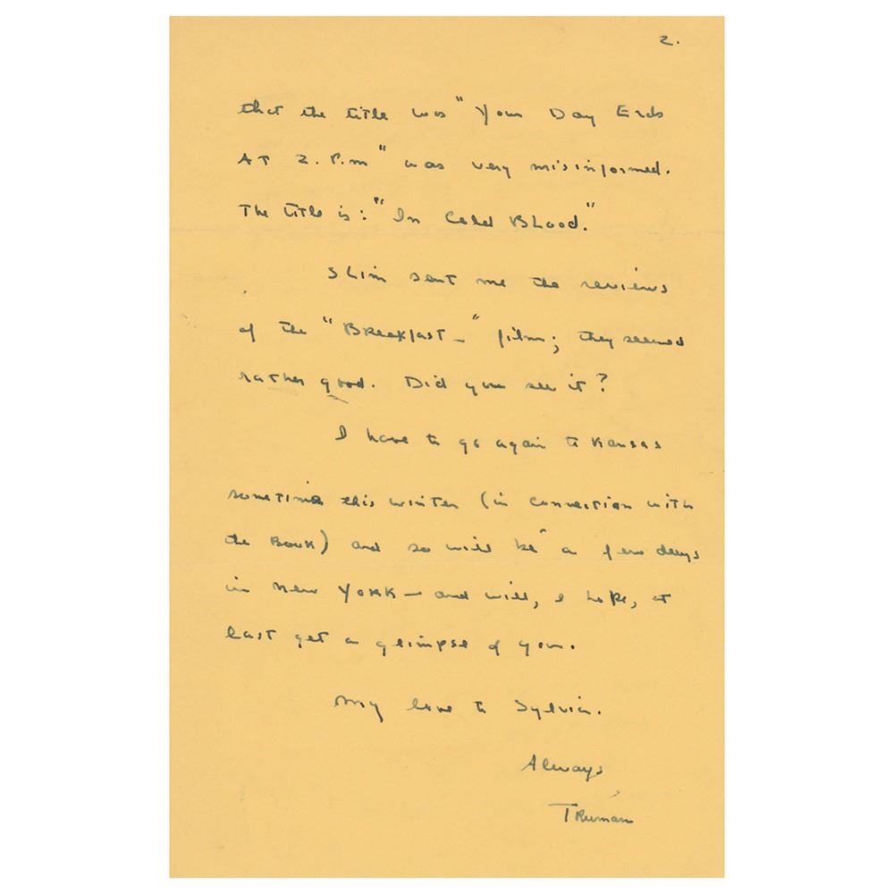 ALS signed “Truman,” two pages on two adjoining sheets, 5.5 x 8.5, October 16, 1961. Handwritten letter to newspaper columnist Leonard Lyons, in part: "So: you came to Spain, and did not come to visit, or forewarn in any way?! Actually, I don’t blame you; it’s a very dull place, this, and my life is among the dullest of all. However, my book is something more than half done—by the way, whoever told you that the title was 'Your Day Ends At 2 PM' was very misinformed. The title is: 'In Cold Blood.' Slim sent me the reviews of the “Breakfast-” film; they seemed rather good. Did you see it? I have to go again to Kansas sometime this winter (in connection with the book) and so will be a few days in New York—and will, I hope, at least get a glimpse of you." In fine condition. Accompanied by the original mailing envelope, addressed in Capote's hand, incorporating his surname ("Capote") in the return address on the flap. A remarkable letter referring to both his most famous titles.