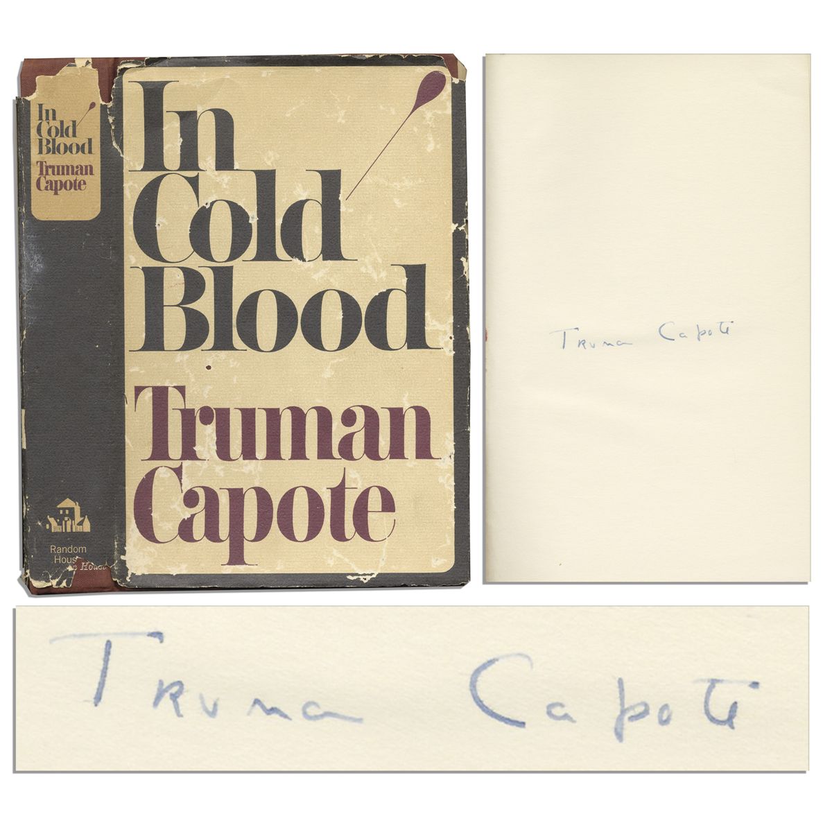 Truman Capote signed first printing of ''In Cold Blood'', published by Random House: New York: 1965. Tipped-in fly-leaf is signed, ''Truman Capote'' in blue ink, likely from a bookstore signing. Bound in burgundy cloth boards with gilt lettering and top edge black. Measures 6'' x 8.75'' and runs 343pp. Light cocking to spine, else near fine. With original unclipped dustjacket, which is in very good condition, with toning and chipping.