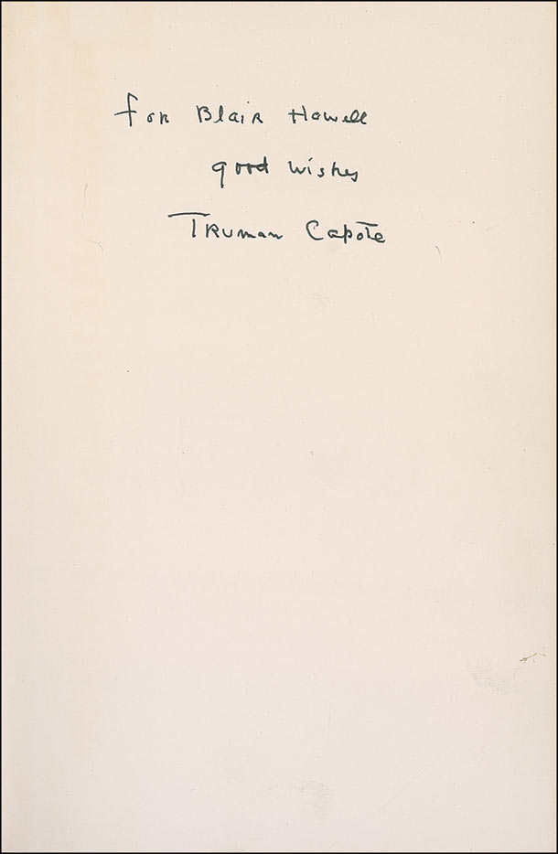 Signed book: Music for Chameleons. First edition. NY: Random House, 1979. Hardcover with dustjacket, 5.75 x 8.5, 262 pages. Signed and inscribed in black ink on the first free end page “For Blair Howell, good wishes, Truman Capote.” In fine condition, with an embossed ownership imprint on the second free end page and light wear to the dustjacket.