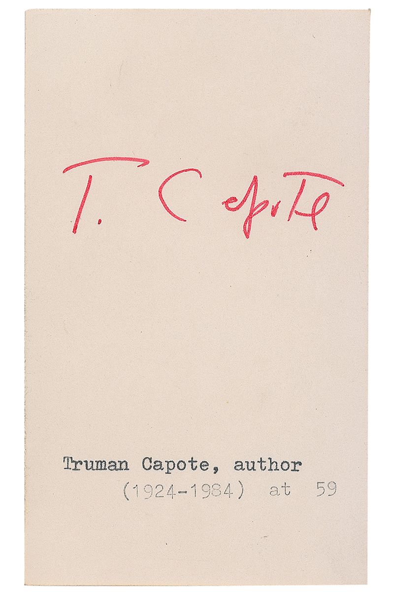 Felt tip signature, “T. Capote,” on an off-white 3 x 5 card with typed collector’s notations along bottom. In fine condition.