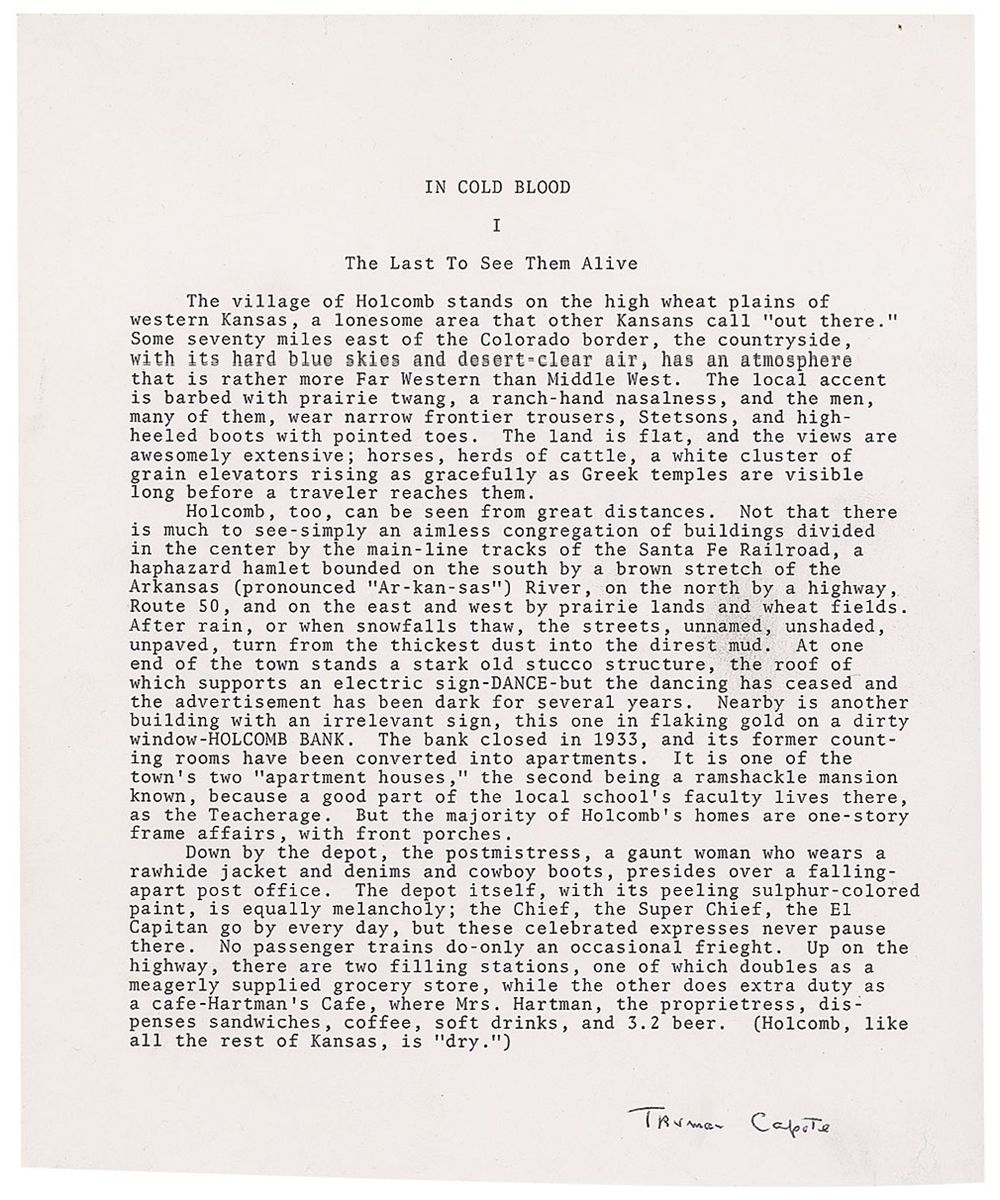 Souvenir typescript, one page, 8.5 x 11, from In Cold Blood, Chapter One, The Last to See Them Alive. In part, “The village of Holcomb stands on the high wheat plains of western Kansas, a lonesome area that other Kansans call ‘out there.’” Signed at the bottom in black ballpoint. In fine condition, with a small area of paper loss to bottom right edge.