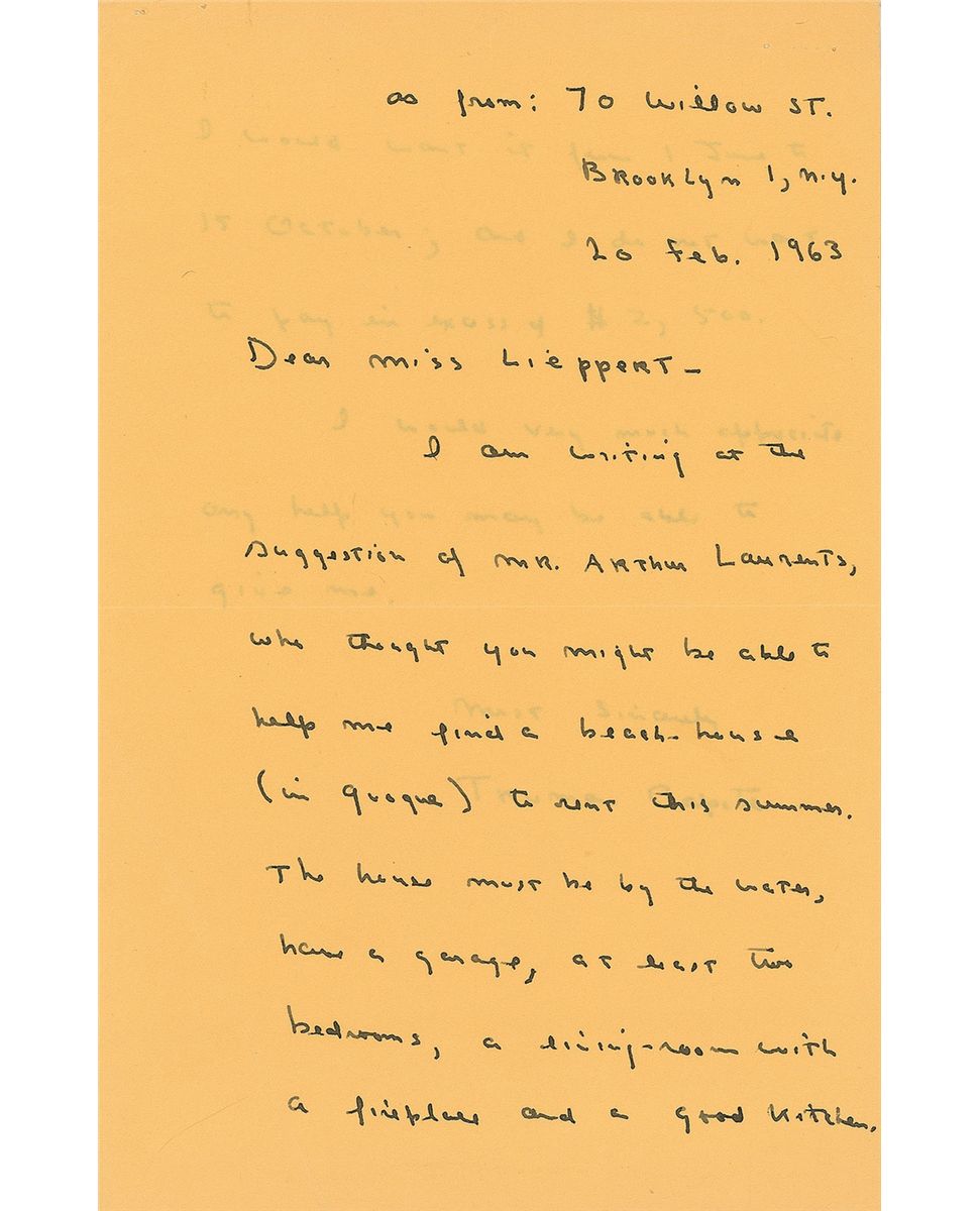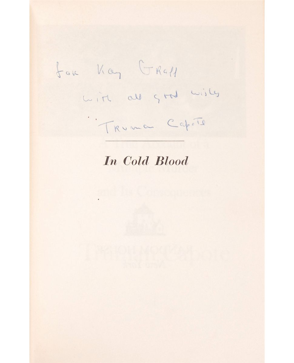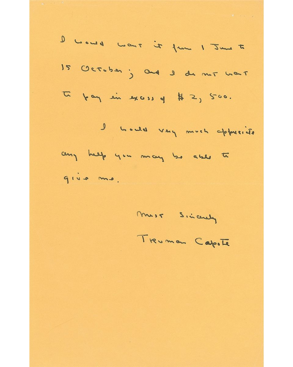 Signed book: In Cold Blood. Book club edition. NY: Random House, 1965. Hardcover with dust jacket, 5.75 x 8.5, 343 pages. Signed and inscribed on the half-title page in blue ballpoint, “For Kay Graff, with all good wishes, Truman Capote.” Autographic condition: fine. Book condition: VG/VG-. Also included is an ALS, two pages on two adjoining sheets, 5.5 x 8.5, February 20,1963, in part: “I am writing at the suggestion of Mr. Arthur Laurents, who thought you might be able to help me find a beach house (in Quogue) to rent this summer. The house must be by the water, have a garage, at least two bedrooms, a living-room with a fireplace and a good kitchen…I do not want to pay in excess of $2,500.” Letter in fine condition. Capote was working on writing In Cold Blood at the time of this letter, widely considered his magnum opus.
