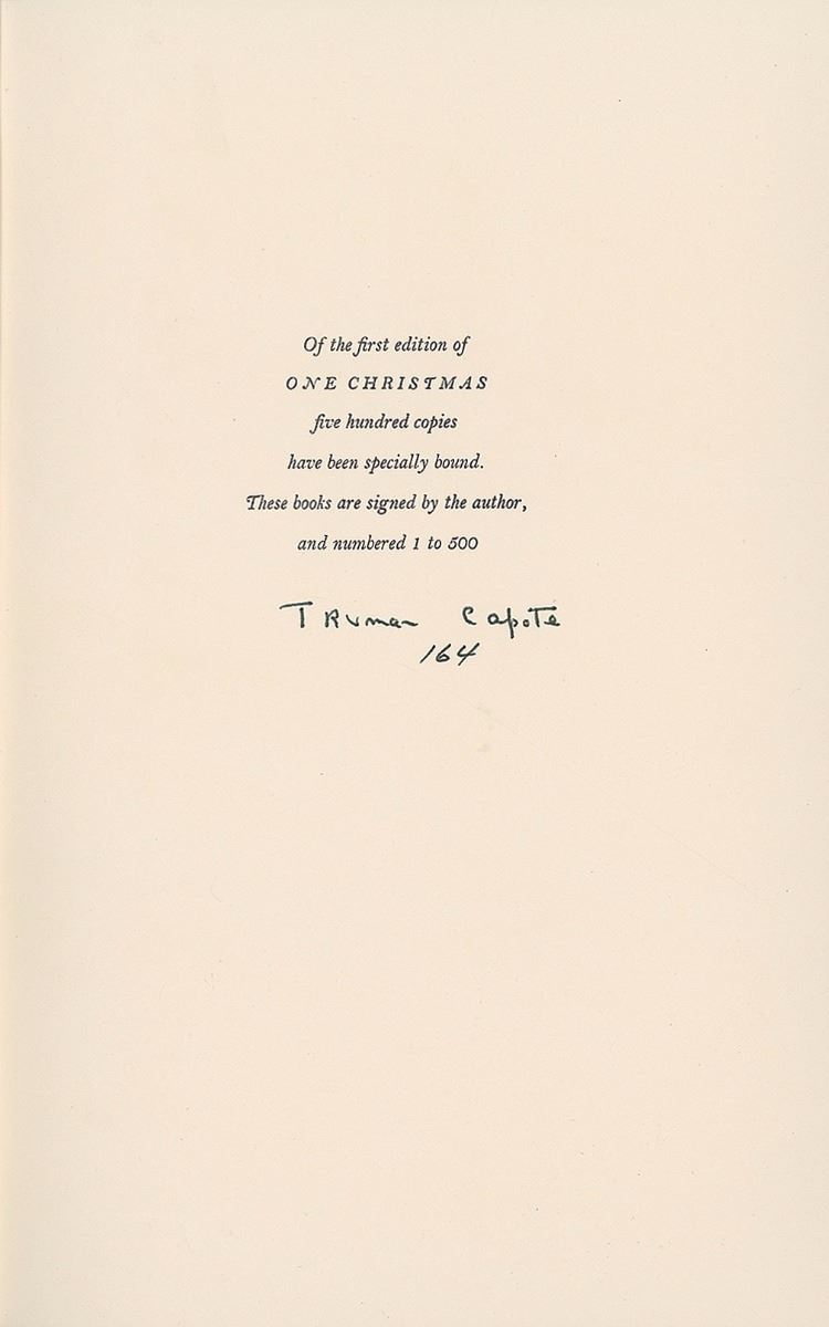 Signed book: One Christmas. First edition, limited issue, numbered 164/500. NY: Random House, 1983. Hardcover with slipcase, 6 x 9.5, 41 pages. Signed on the colophon in black ink. Autographic condition: fine. Book condition: F/None, in a fine slipcase.
