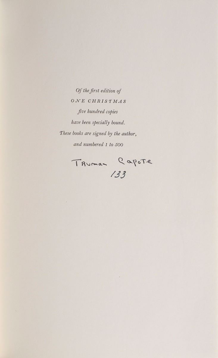 Signed book: One Christmas. Limited first edition, numbered 133/500. NY: Random House, 1983. Hardcover with slipcase, 6.5 x 9.75, 41 pages. Signed on the colophon in black ink by Capote. In fine condition.