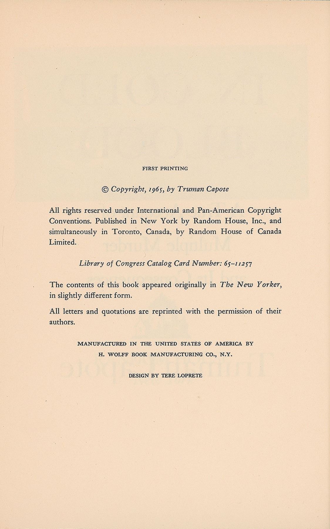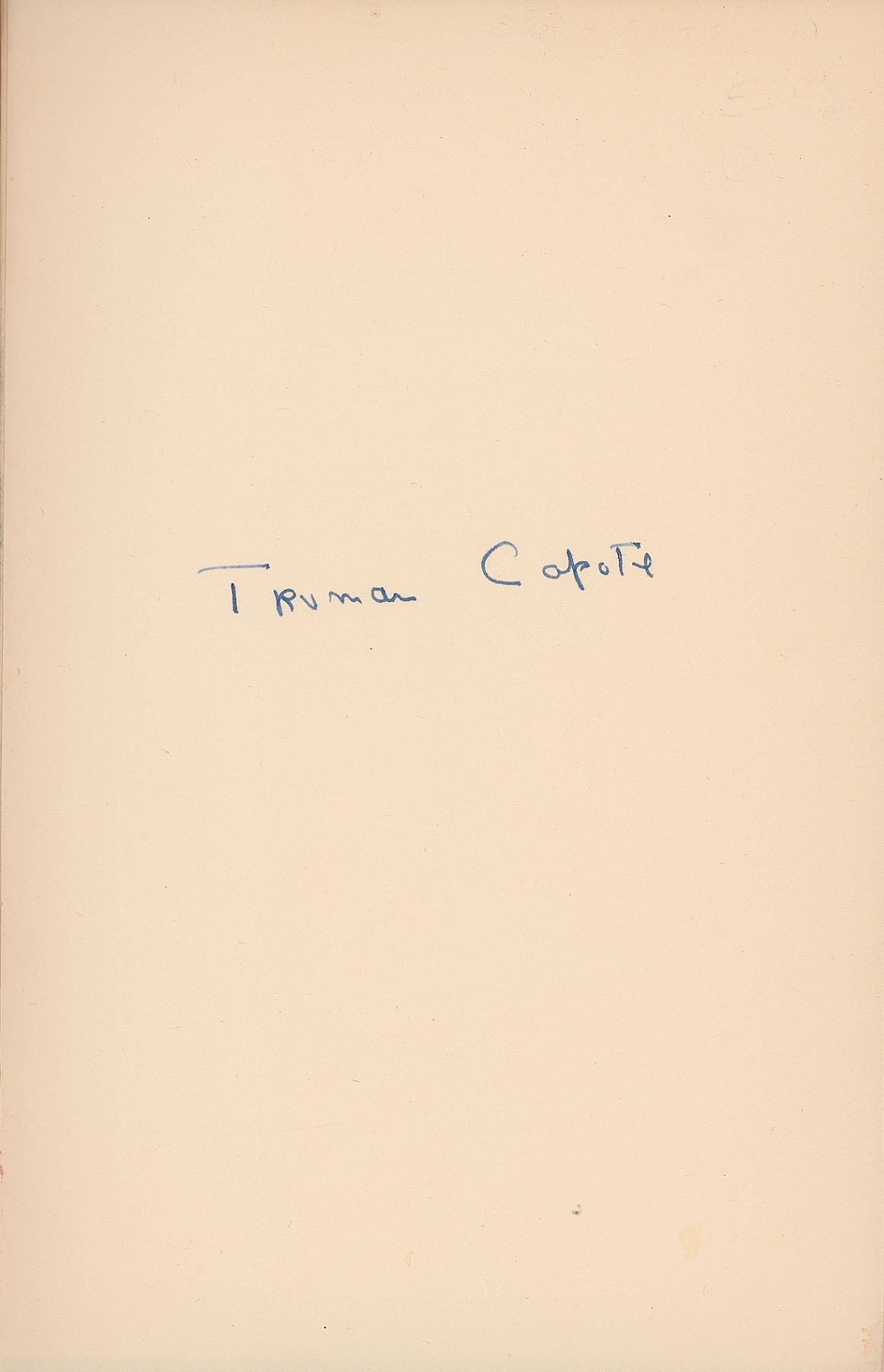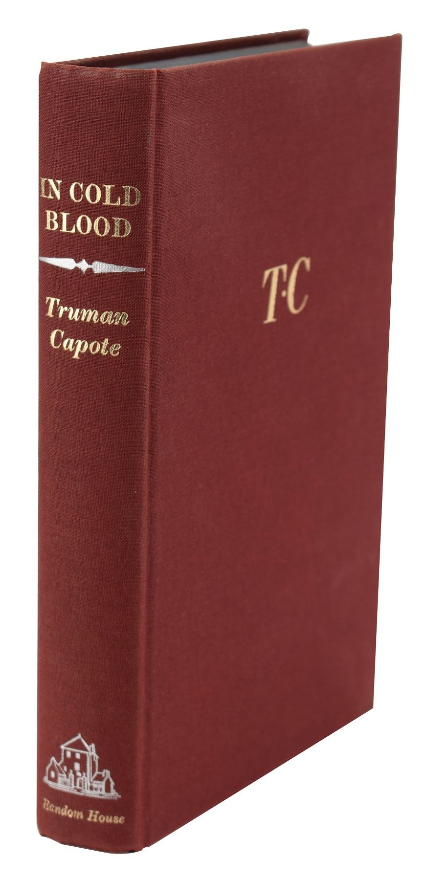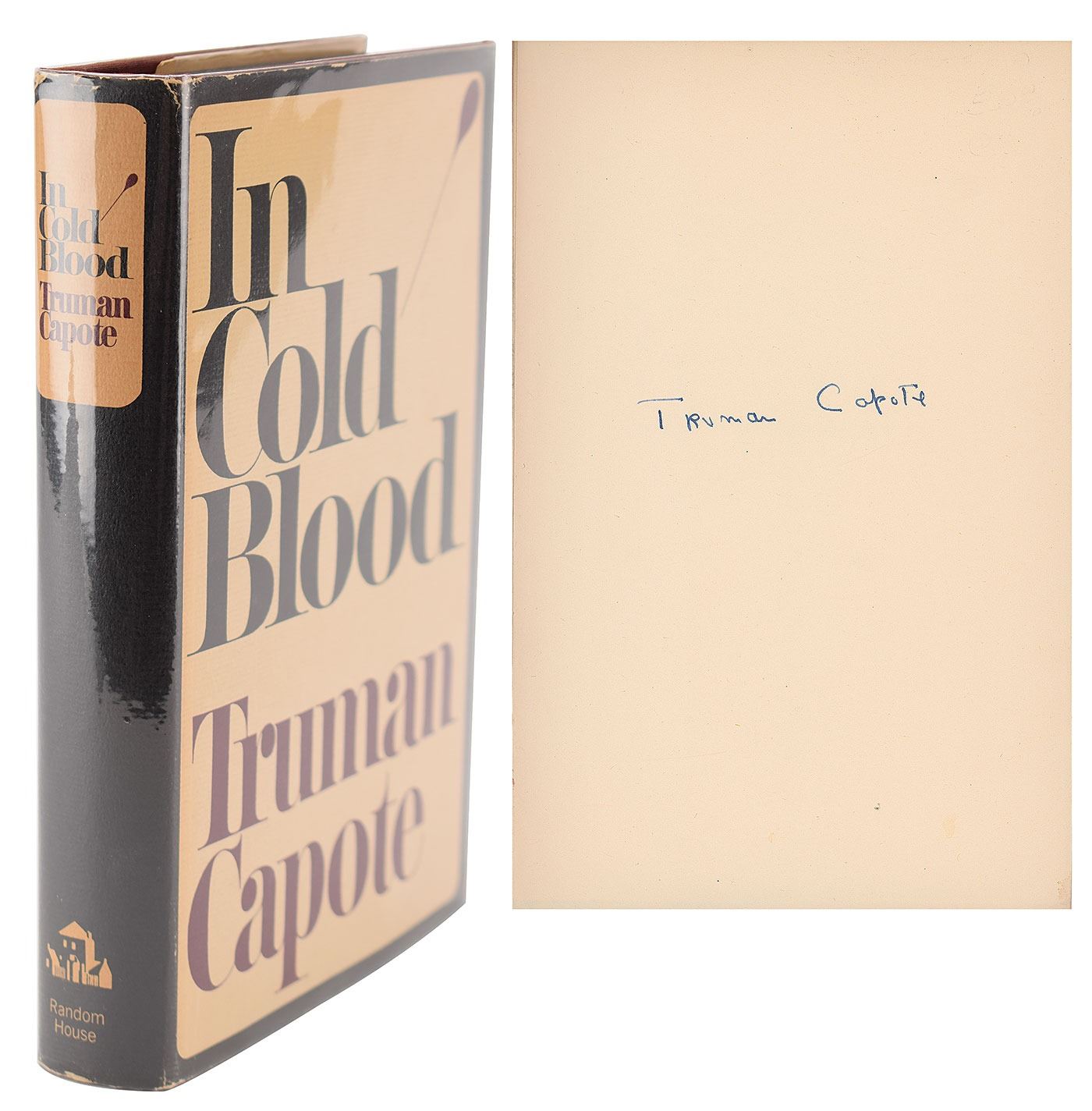 Signed book: In Cold Blood. First edition, first printing. NY: Random House, 1965. Hardcover with dust jacket (with $5.95 price intact and 1/66 date on lower front flap), 6.25 x 8.75, 343 pages. Signed on an opening page in blue ink by Truman Capote. Autographic condition: fine. Book condition: VG+/VG+, with trivial edgewear at the extremities of the dust jacket's spine; a bookmark from the Kroch's & Brentano's "First Edition Circle" is laid in. A marvelous example of this pioneering 'non-fiction novel' that defined the true crime genre.