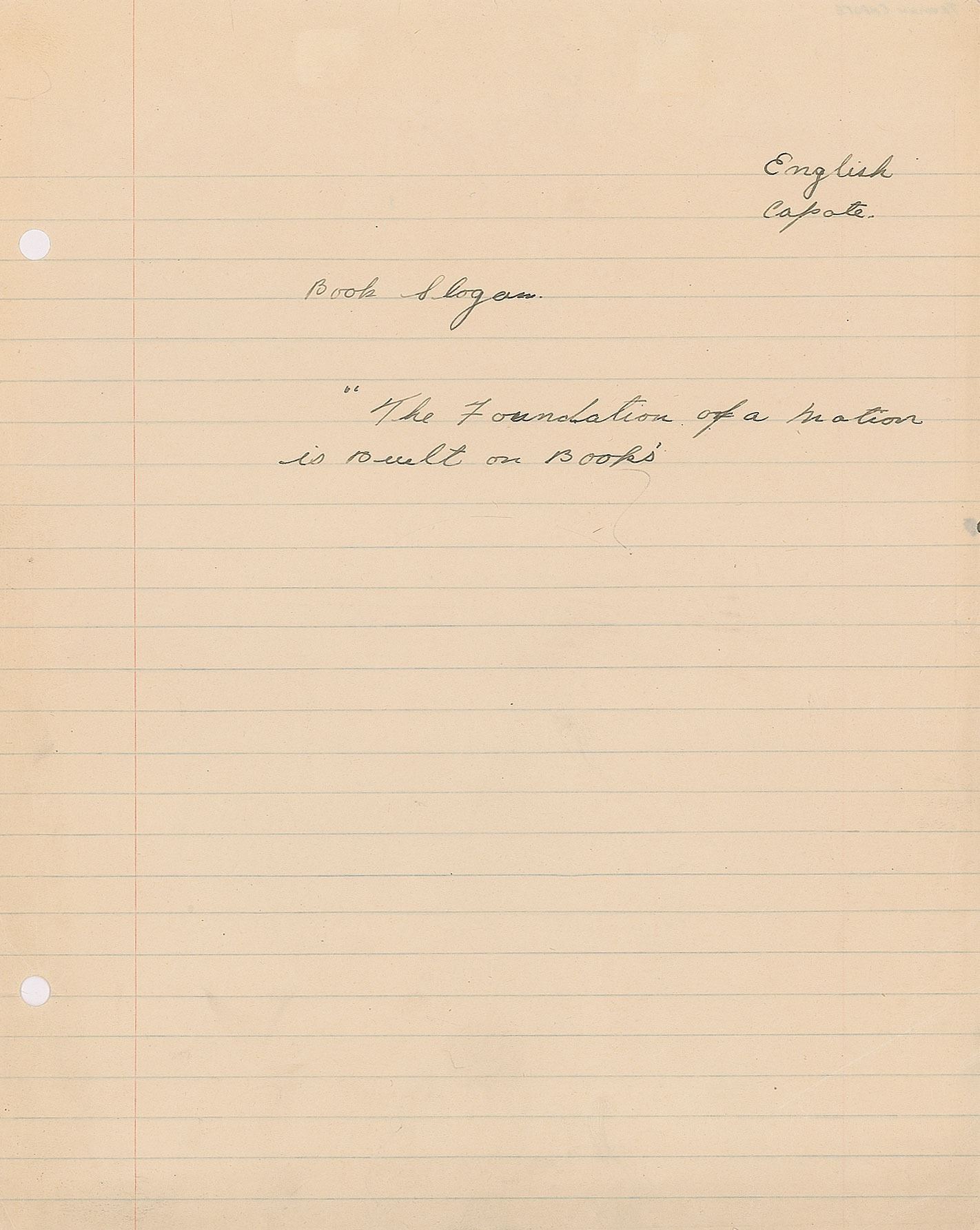 AQS on an off-white 8 x 10 sheet, signed in the upper right corner, "English, Capote." Capote pens a "Book Slogan," possibly written as part of a school assignment. In full: "'The foundation of a nation is built on books.'" In fine condition.