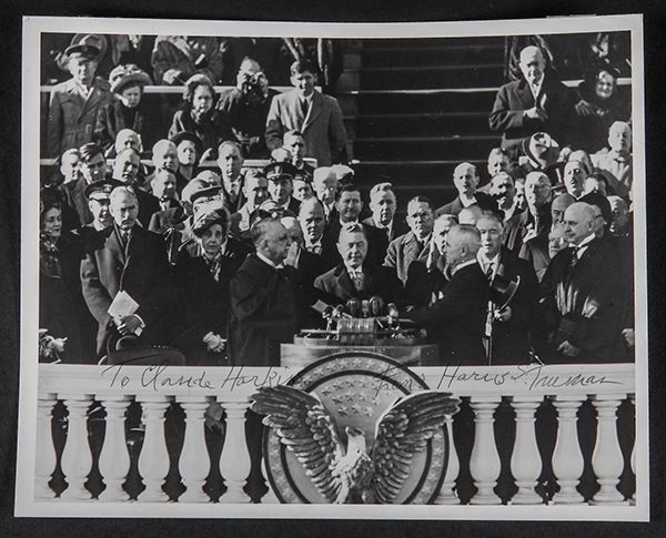 Truman, Harry S. Photograph of President Truman being administered the Oath of Office by Chief Justice Fred M. Vinson on 20 January 1949, signed and inscribed "To Claude Harkins From: Harry S. Truman," n.p., n.d. Signed by President Truman after he retired to Independence, Missouri. The photo is an official U.S. Army photo; stamped information on the verso is headed "Inauguration Day in Washington, D.C. 20 January 1949." Fine condition. Ex Claude Harkins Collection.