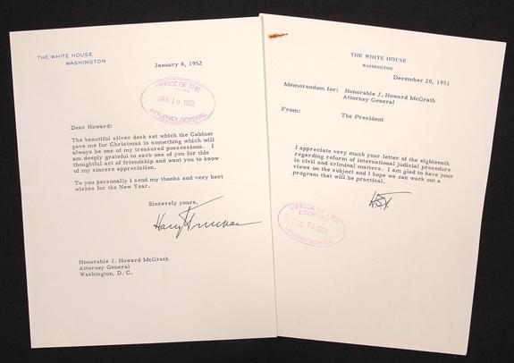 With a memo signed ("H.S.T.) on The White House letterhead, December 20, 1951, thanking McGrath for his letter "regarding reform of international judicial procedure in civil and criminal matters." Both items are stamped from the Attorney General's office. Both fine.