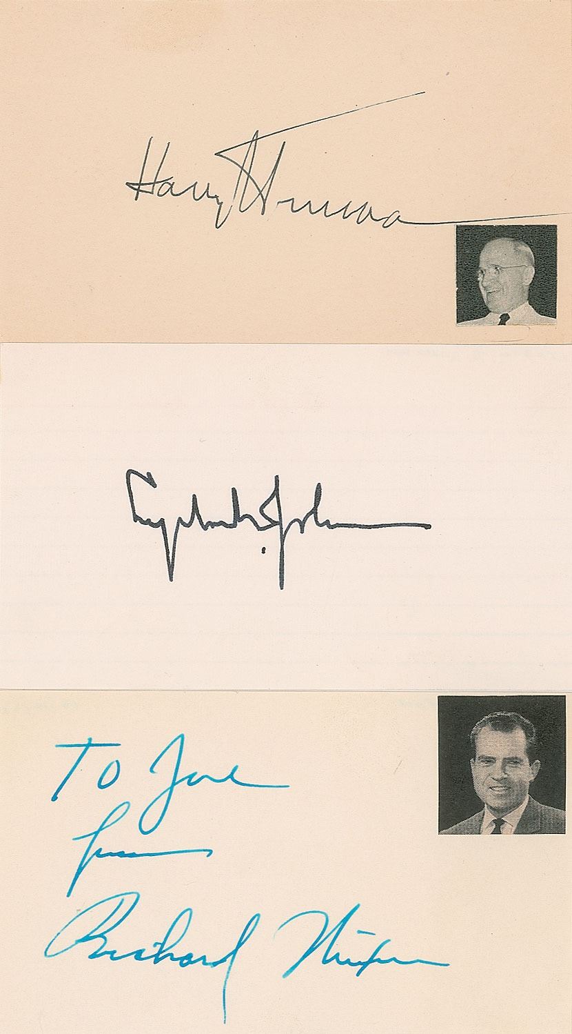 Group of three vintage fountain pen signatures of presidents on individual off-white 5 x 3 cards, including: "Harry S. Truman," "Lyndon B. Johnson," and "To Joe, from Richard Nixon." In overall fine condition. Originally obtained in person by a New York autograph collector who collected from the 1950s through the 2000s.