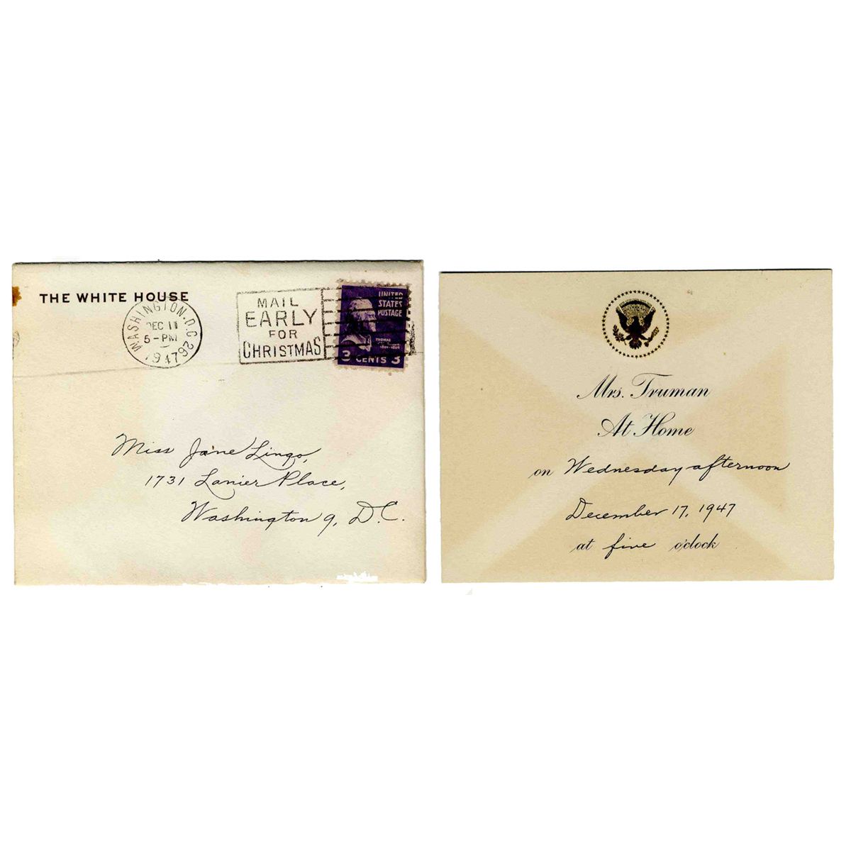 Very nice invitation to the Truman White House dated 17 December 1947. Lot includes original postmarked White House envelope addressed to Miss Jane Lingo of Washington DC and official invitation with embossed Presidential seal and engraved ''Mrs. Truman At Home'' (filled out though not personalized to recipient). Invitation and envelope measure 4.5'' x 3.5'' and 4.75'' x 3.75'' respectively. Very good condition with some toning.