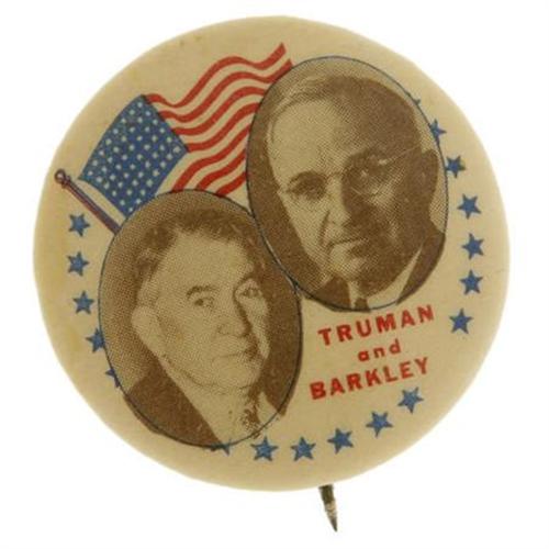 <B>Truman and Barkley: 1/4" Pinback</B></I> Sepia portraits of the 1948 Democratic candidates are positioned with a colorful American flag and a blue star border. This attractive design was also used by Thomas Dewey and Earl Warren. Excellent condition. <BR><BR><b>Shipping:</b> Miscellaneous Collectibles, Smal (<a target="_blank" href="http://www.heritageauctions.com/common/shipping.php">view shipping information</a>)