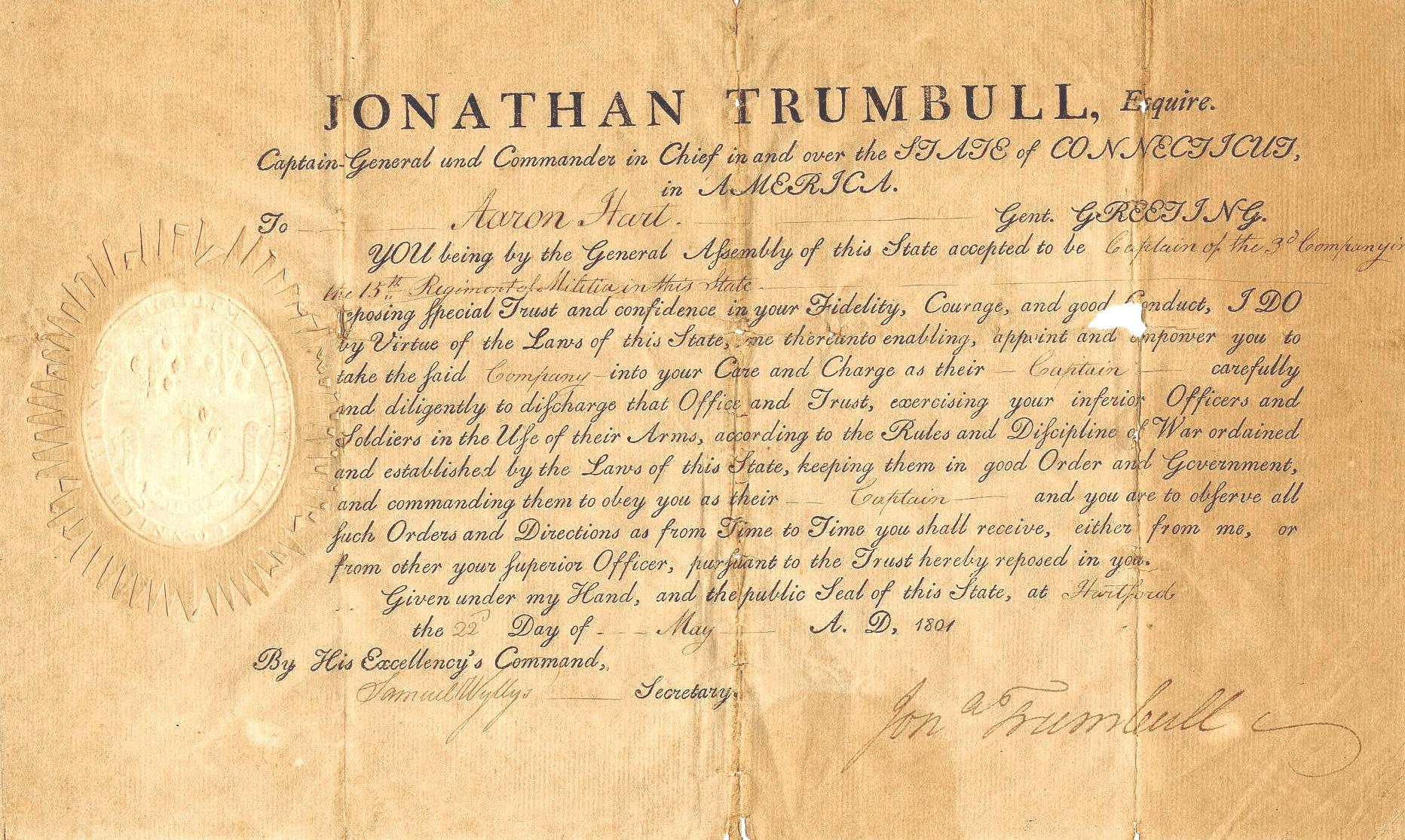 Jonathan Trumbull, Jr. signed military appointment. Datelined 22 May 1801, Hartford, CT, printed document signed large in sepia at bottom “Jon Trumbull” by Trumbull, Jr., the older brother of American Revolutionary painter John Trumbull. Trumbull, Jr. served as Connecticut Governor and as the first Comptroller of the U.S. Treasury. In 1795, Trumbull was elected Senator to CT. A 13.5” x 8.5” document, also signed by Samuel Wyllys, has toning, paper loss and chips; overall good condition.