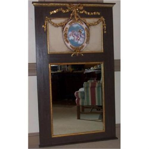 </font></strong>Mirror in the French Trumeau Styling. Large enough for that tall ceiling in your home. 36"x61" makes this a truly stunning decorative arts piece. The basecolor is deep chocolate surrounded by gilded gold mouldings and onlays in florals and ribbons. The basecolor behind the oval frame is birch white. The oval frame is antiqued white in color with onlays of gilded gold floral swag and ribbon motifs. The actual glass mirror is 23x31". The 12x14 inch oval surrounds a handpainted canvas done in oils of beautiful cherubs, clouds, ribbons etc.