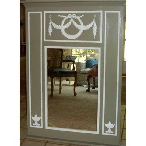 This wonderful handcrafted, trumeau mirror is a must for designers. I call this my Dresden Design. It is the perfect size to be placed above a mantle or a buffet. The color is a warm olive green with white bas-relief. Perfect for today's designer fabrics and room decor. The gilded gold pineapples are of molded polymer clays and hand inlayed by the artist herself. This work of art measures 35x47.5 with the mirror measuring 18x30 inches. Shipping costs are quoted at time of purchase. Custom Colors Available.