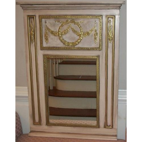 This beautiful work of art combining lincrusta applications along with beautiful wood moldings is trumeau inspired. It is solid wood with 3 dimensional relief filigree embellishments. The moldings are solid wood as is all the trim on top and bottom. The overall size is 32" wide x 40 1/2" tall while the mirror itself is 16" wide x 22" tall. The color is a tawny beige with gold leaf lincrusta moldings and filigree. Each mirror is made by P. Brewer and carries the artist's signature along with limited edition # and date. This mirror would look lovely hanging over a buffet or foyer table. They are also being used in bedrooms and baths. Try it and see how your family will love it. These mirrors are all handcrafted in North Carolina and are a Caroline's exclusive. Note: They are not plastic or mold forms. Each mirror is individually designed, created and signed by the artist. The weight for each mirror varies and the cost thereof depends on how you would like it shipped. We will quote freight upon purchase. we guarantee all our mirrors to your satisfaction. <p>Freight quoted upon purchase.