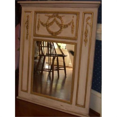 This beautiful work of art combining lincrusta applications along with beautiful wood moldings is trumeau inspired. It is solid wood with 3 dimensional relief filigree embellishments. The moldings are solid wood as is all the trim on top and bottom. The overall size is 32" wide x 40 1/2" tall while the mirror itself is 16" wide x 22" tall. The color is a tawny beige with gold leaf lincrusta moldings and filigree. Each mirror is made by P. Brewer and carries the artist's signature. This mirror would look lovely hanging over a buffet or foyer table. They are also being used in bedrooms and baths. Try it and see how your family will love it. These mirrors are all handcrafted in North Carolina and are a Caroline's exclusive. Note: They are not plastic or mold forms. Each mirror is individually designed, created and signed by the artist. The weight for each mirror varies and the cost thereof depends on how you would like it shipped. We will quote freight upon purchase. Hanging instructions are included and we guarantee all our mirrors to your satisfaction. <p>