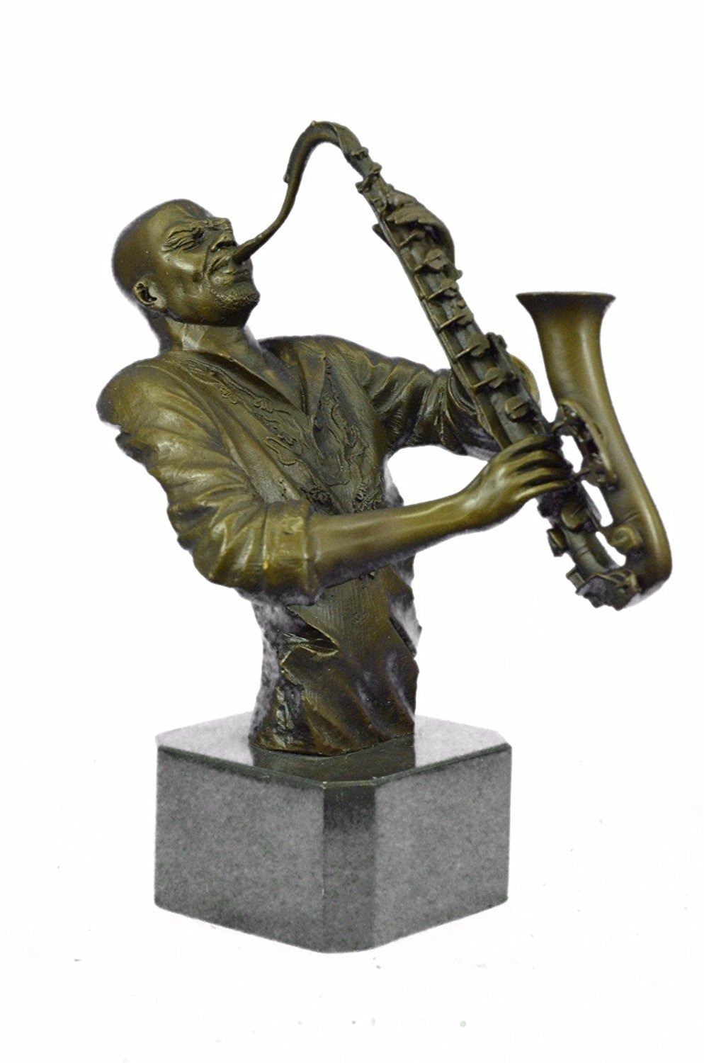 This gorgeous 100% Real Figural Decoration of Bust of a Black Musician Playing the saxophone figurine has the finest details and highest quality you will find anywhere! The craftsmanship of this lovely Saxophone Player Figurine is truly remarkable and this masterwork fills any room with pure joy of classic blue jazz.He was molded using the ageold method of lostwax casting and stained with a brown patina for preservation. He stands upon a bronze plinth that is mounted to a black marble base. Bronze Dimensions with Marble Base: Height 10 X Width 9 inches. Weight: 7 LBS. Inventory: 27YRD7614372