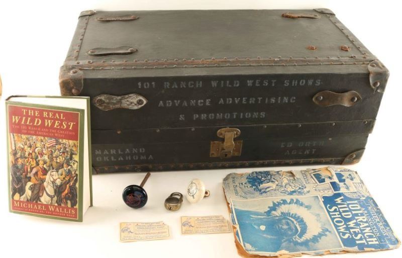 '101 Ranch Wild West Shows Advance Advertising & Promotions, Ed Orth Agent, Marland, Oklahoma' on front of trunk. Wood construction with black leather covering. Metal hardware and tack design all with a nice rusty patina. Measures 27 1/2"l x 10"h x 15"d. One of the leather details on top is missing and one handle shows age and wear. Includes key. (2) Complimentary Tickets for 40¢ each, (1) 'Special Song Album Miller Bros. and Arlington 101 Ranch Wild West Shows' incomplete and pages are torn, show age. (2) '101 Ranch Ponca City, Okl' doorknobs-one black, one white. (1) '101' Made in USA padlock. Also included is the book 'The Real Wild West The 101 Ranch and the Creation of the American West' by Michael Wallis,
