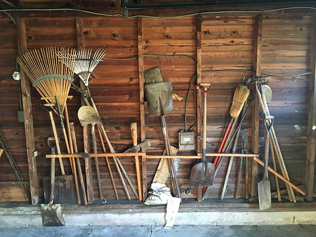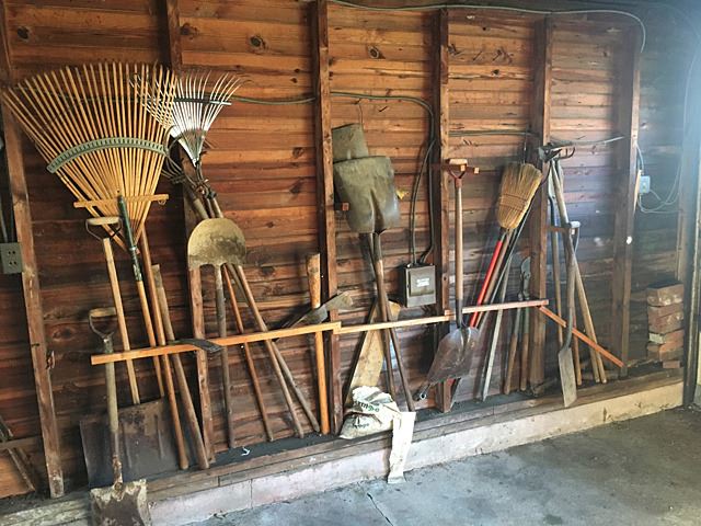 As found in the barn at the farm, trunks, blanket chests, lawn and garden tools including rakes, shovels, hoes, etc.